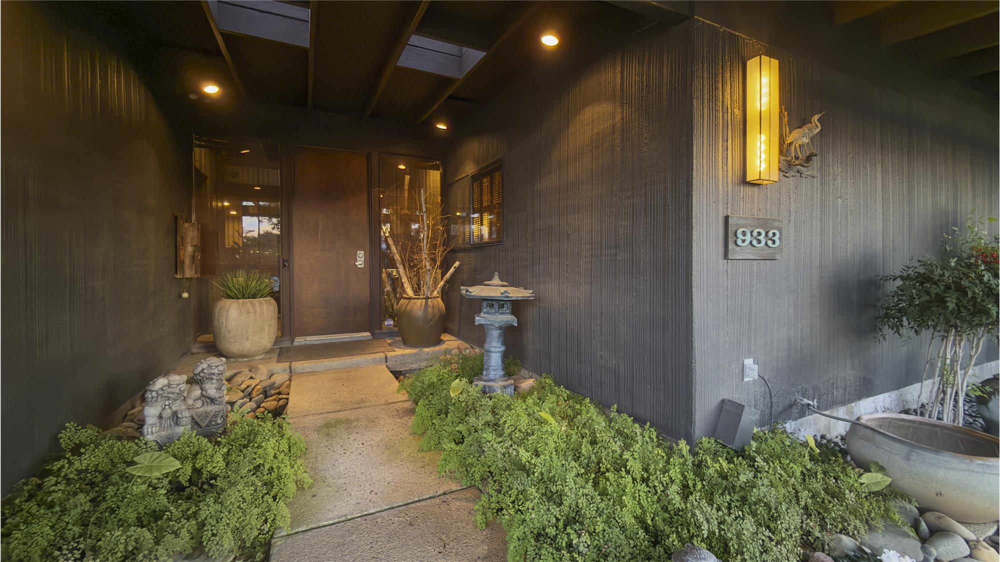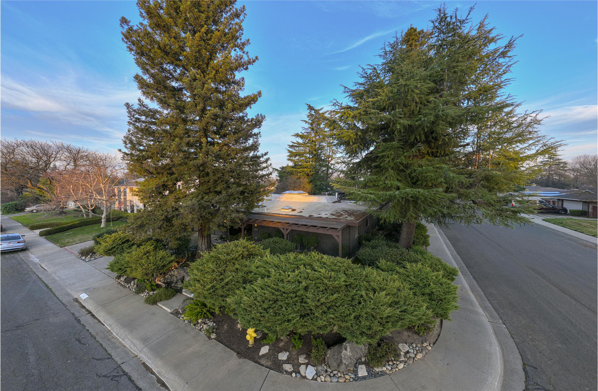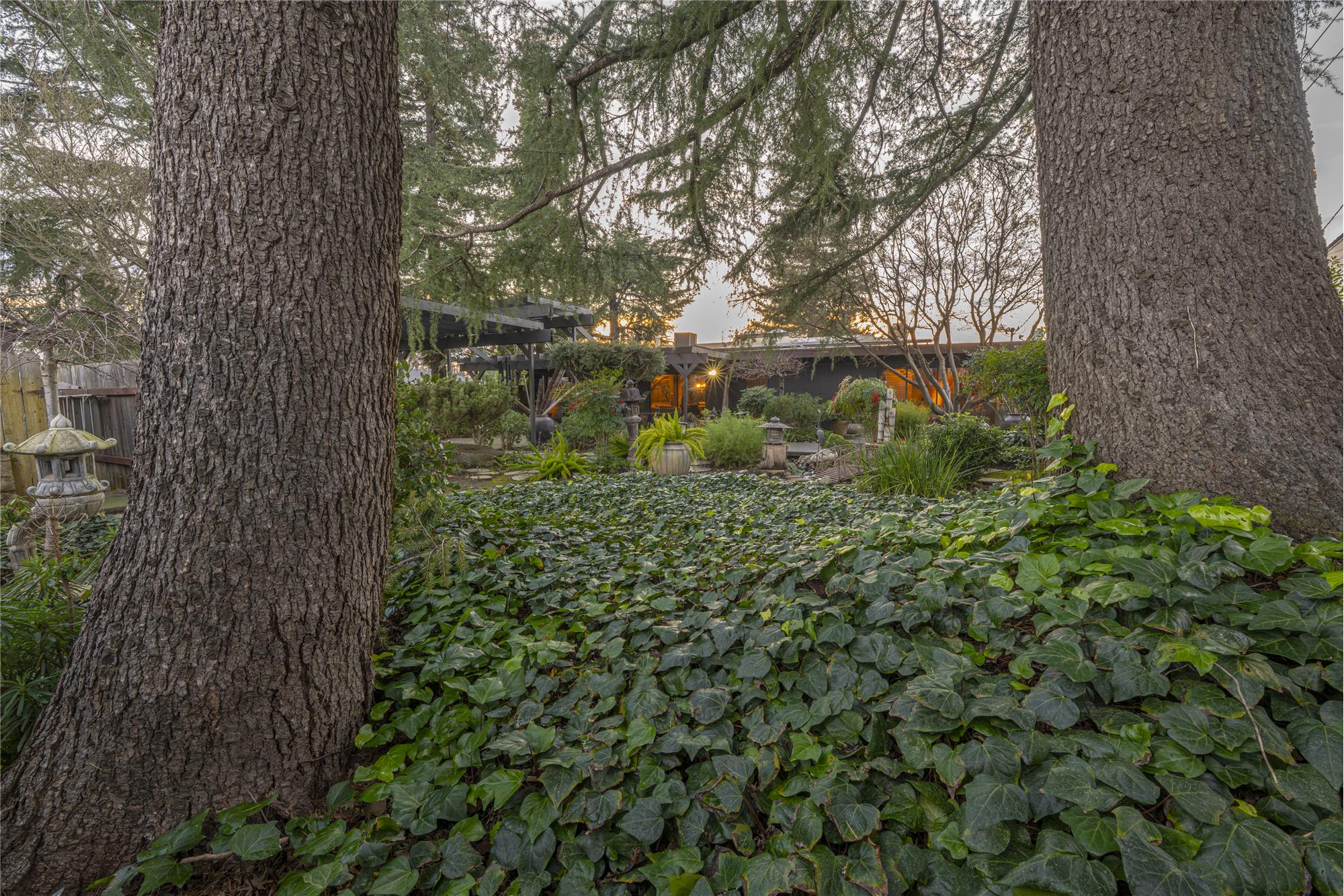 Woodland has the prettiest winters of anywhere I’ve been, with this soft misty light from the tule fog that lasts much of the day, and the house makes the most of it. With the long wall of sliding glass doors facing east into the mature garden, it feels like a Japanese tea house. You’re warm inside, looking out through the glass at the redwoods and cedars, the sculptural junipers, the stone lanterns. The trees are nearly fifty years old now, well maintained by arborists, and the canopy they create is extraordinary. The front is shielded by mature junipers six to eight feet tall that provide screening and privacy while still feeling open and welcoming.