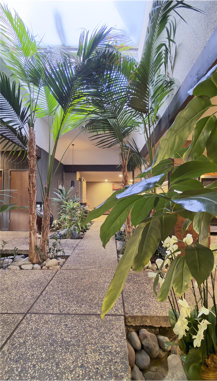The enclosed atrium with fourteen-foot palms reaching toward the skylight.