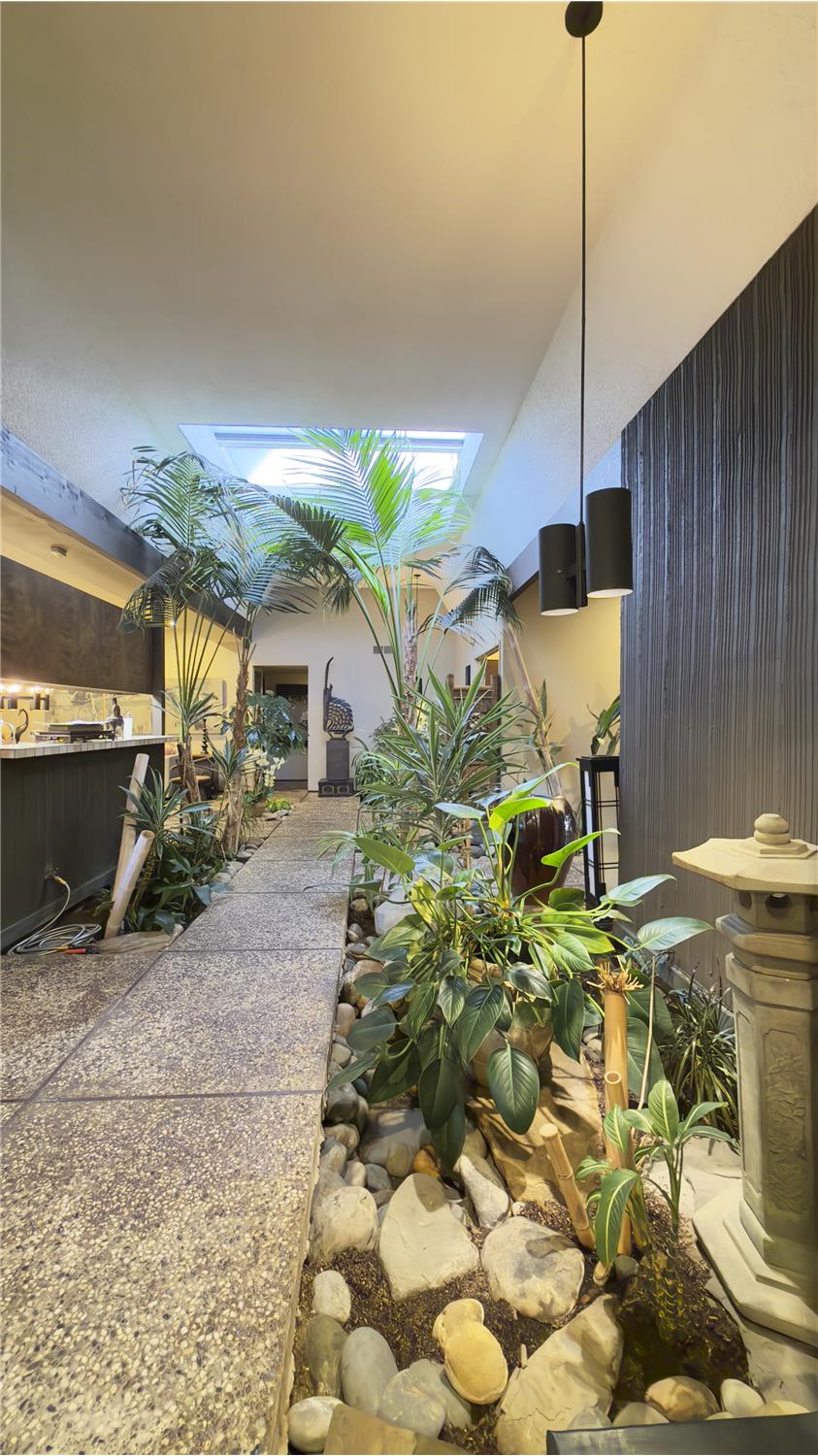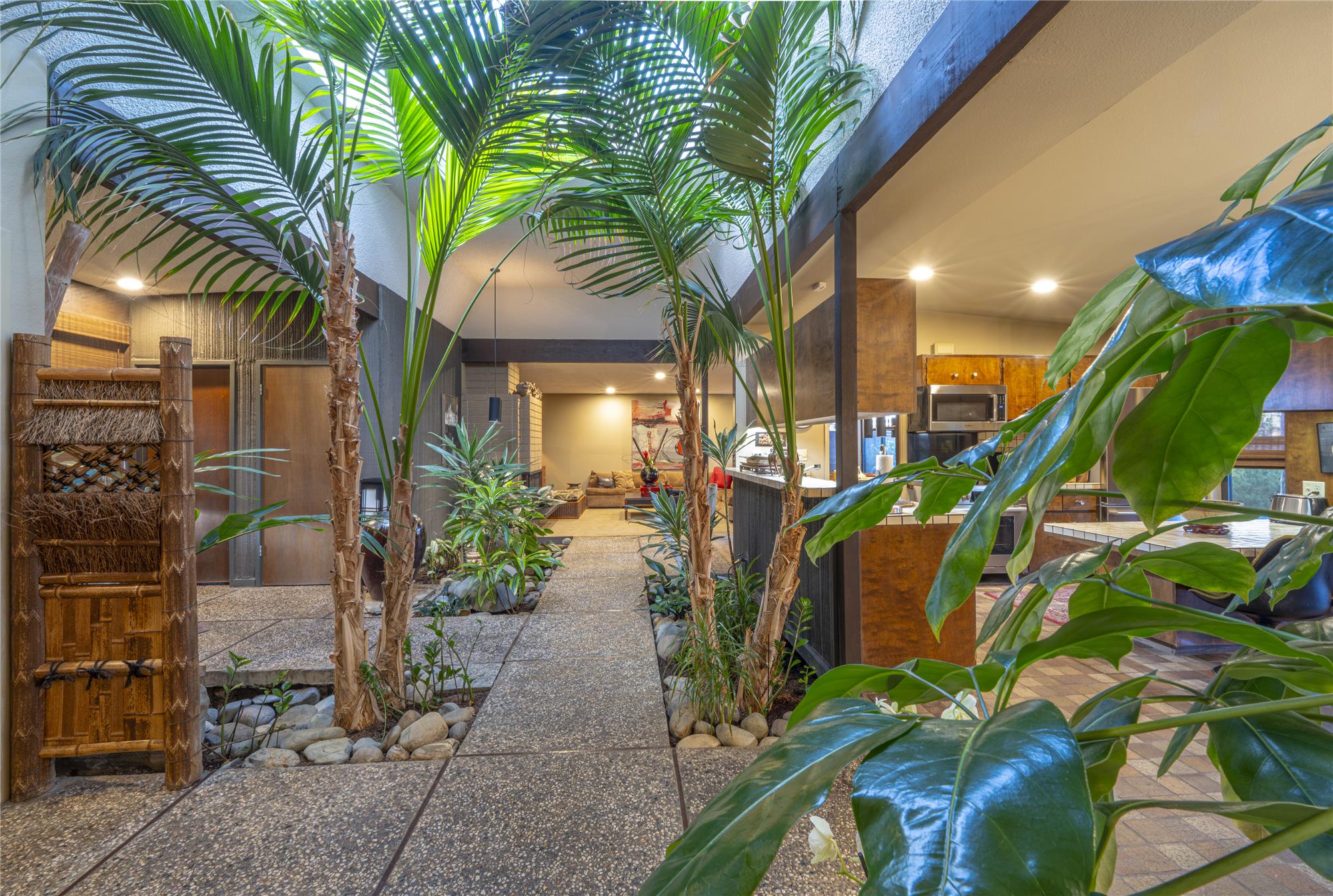 His signature move was the dry creek. Ours starts at the enclosed entry, runs through the indoor atrium alongside exposed aggregate walkways, continues out through the backyard, and disappears behind a berm at the far end of the lot—so you always feel the creek keeps going, out into the landscape beyond. He’d sometimes hide a small bubbling fountain just out of sight, so you’d swear the creek actually had water. He also used lighting in unexpected ways—he might install a skylight and place bamboo inside it so it appeared to be growing up through the roof. In this home, he selected palms to reach up to the solar dome for the same effect.