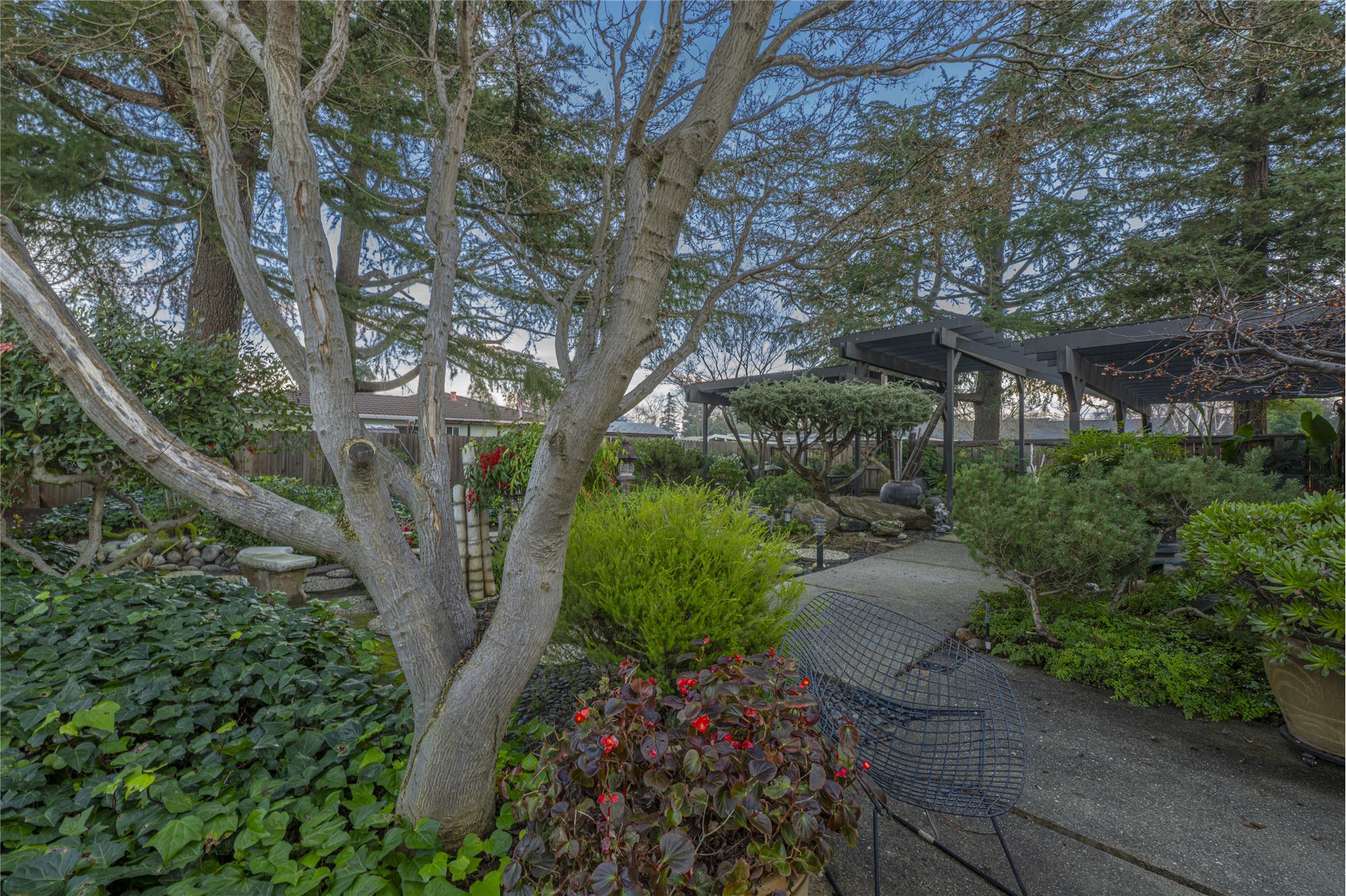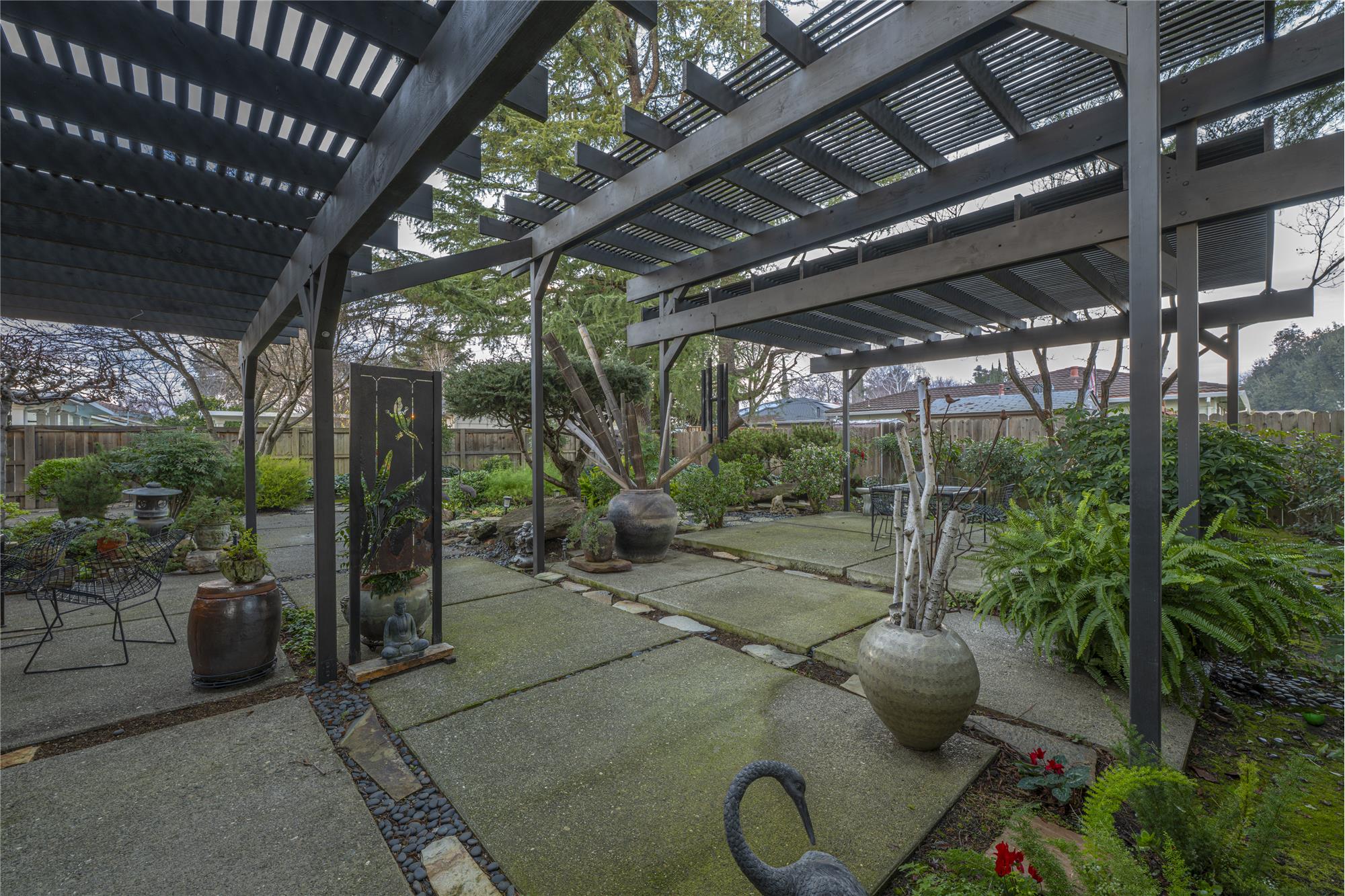 Over twelve hundred square feet of patio space beneath pergolas and a canopy of mature redwoods and cedars.