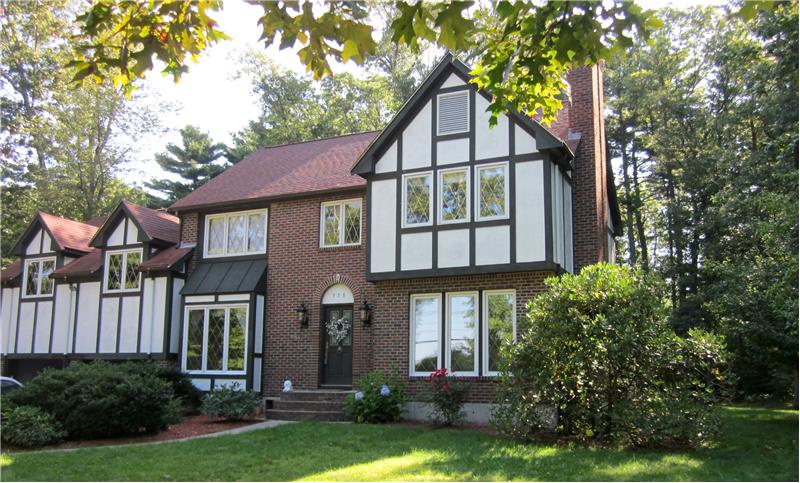Framed behind a stone wall in a pretty setting, this brick front Tudor style colonial exhibits the dramatic curb appeal of an English manor. Upon entering you have a feeling of space & warmth accentuated by brilliant sunlight streaming through large, long windows. High ceilings with Rich wood trim throughout. 2 story foyer. Marble fireplace, french doors. Birch cabinets & Butlers doors to kitchen. 3 spacious bedrooms. Walk in cedar closet. Huge media/family room offering skylights with wet bar. 1st floor laundry. Circular driveway.