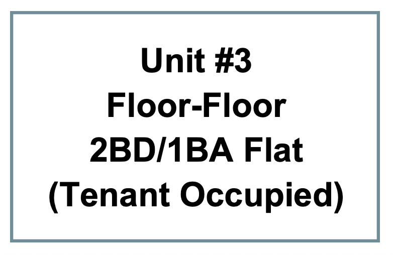 Lower-level units #1 and #2 are remodeled 1-bedroom apartments with a shared laundry room. Units #1 and #2 can be delivered vacant. The middle full-floor unit #3 offers 2 bedrooms and 1 full bath, private laundry and is tenant-occupied (rent $3,229/month; lease: month-to-month). The property includes 3-car parking (1-car garage and 2-car carport) available for owner use or to rent out, plus abundant street parking.
