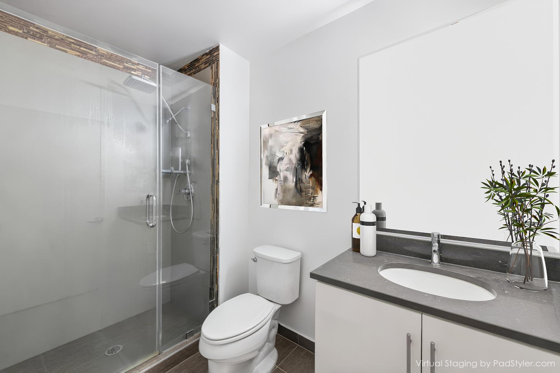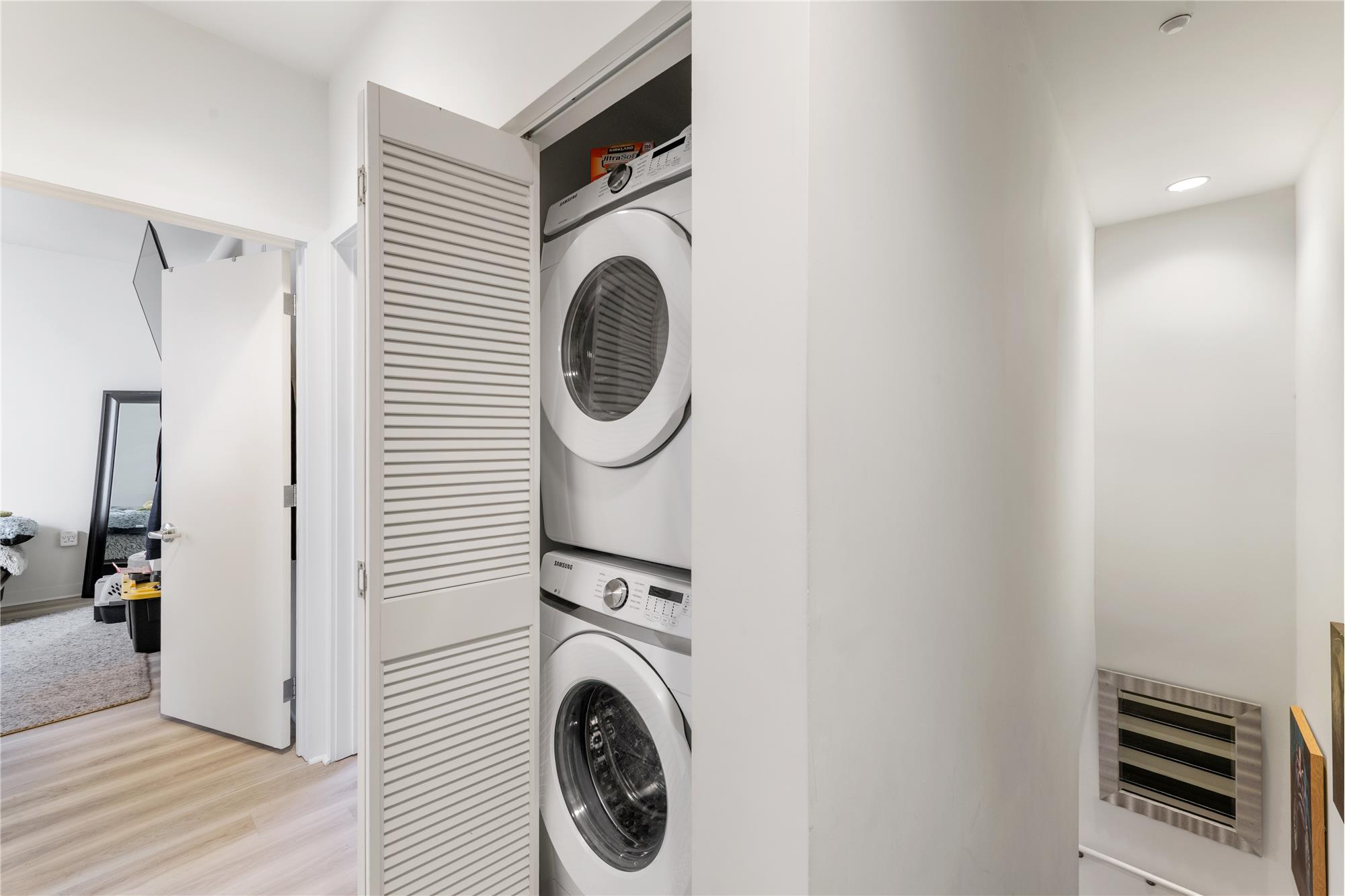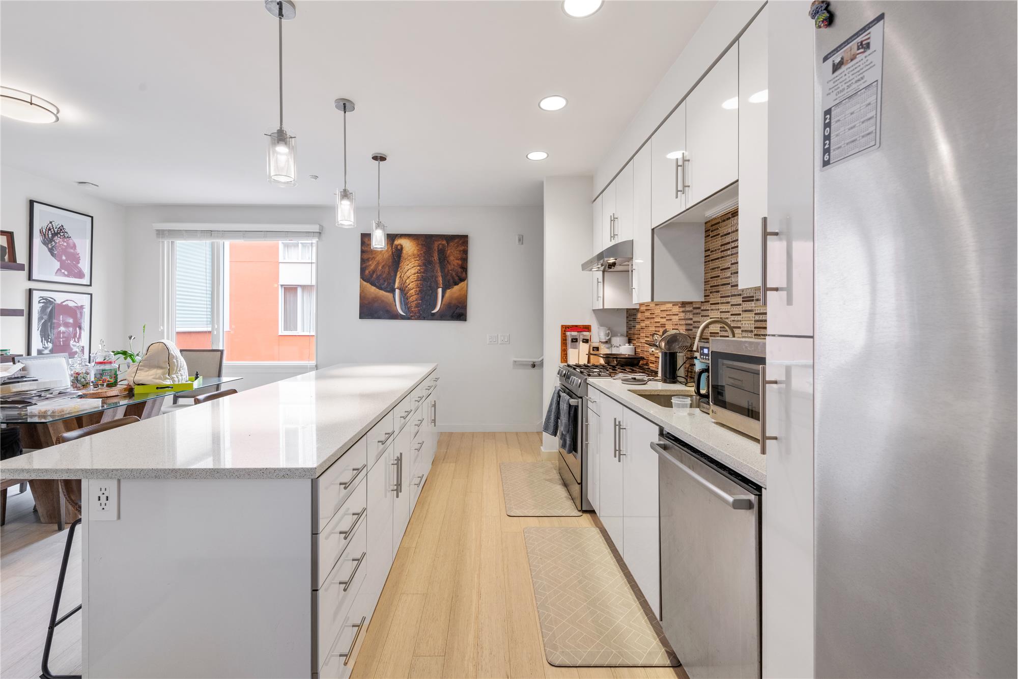 The open-concept living space is made for entertaining, featuring elegant laminated floors throughout and a seamless flow into a designer kitchen that steals the show. The oversized 8+foot quartz island invites everything from casual breakfasts to cocktail-hour conversations, while sleek stainless steel appliances add a polished, modern finish. Upstairs, you'll find two generously sized bedrooms, including a serene primary suite with an en-suite bath, your own personal escape. Laundry day is a snap with a washer and dryer conveniently located upstairs, because everyday luxury matters.