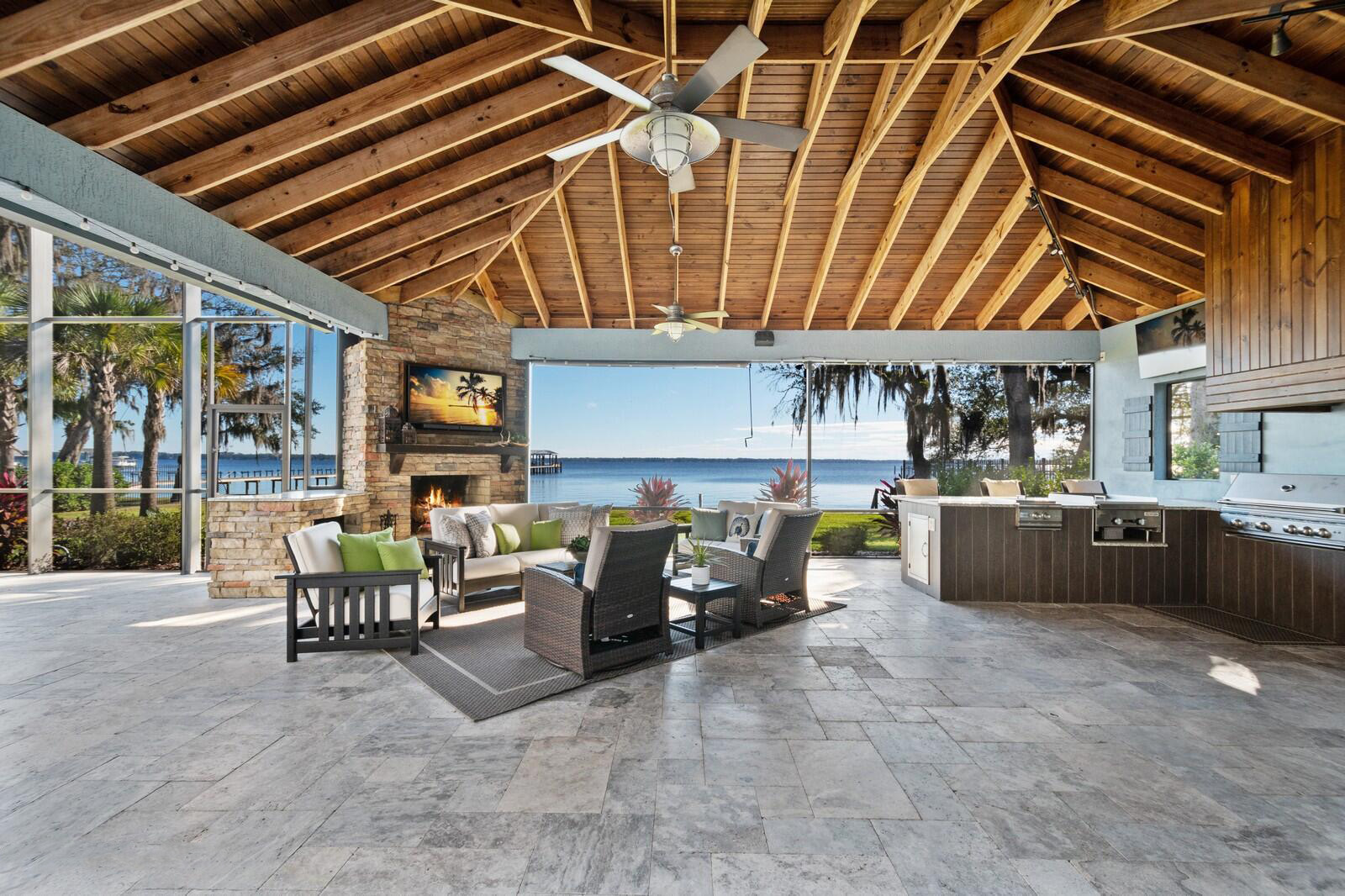 A 768 sq ft cabana area beckons with a full, state-of-the-art outdoor kitchen, alongside living and dining spaces complete with a beautiful stone fireplace. The entire entertainment area is enclosed by a screened enclosure, offering ample outdoor living space and optimal privacy while overlooking the lush landscape and the serene river.
