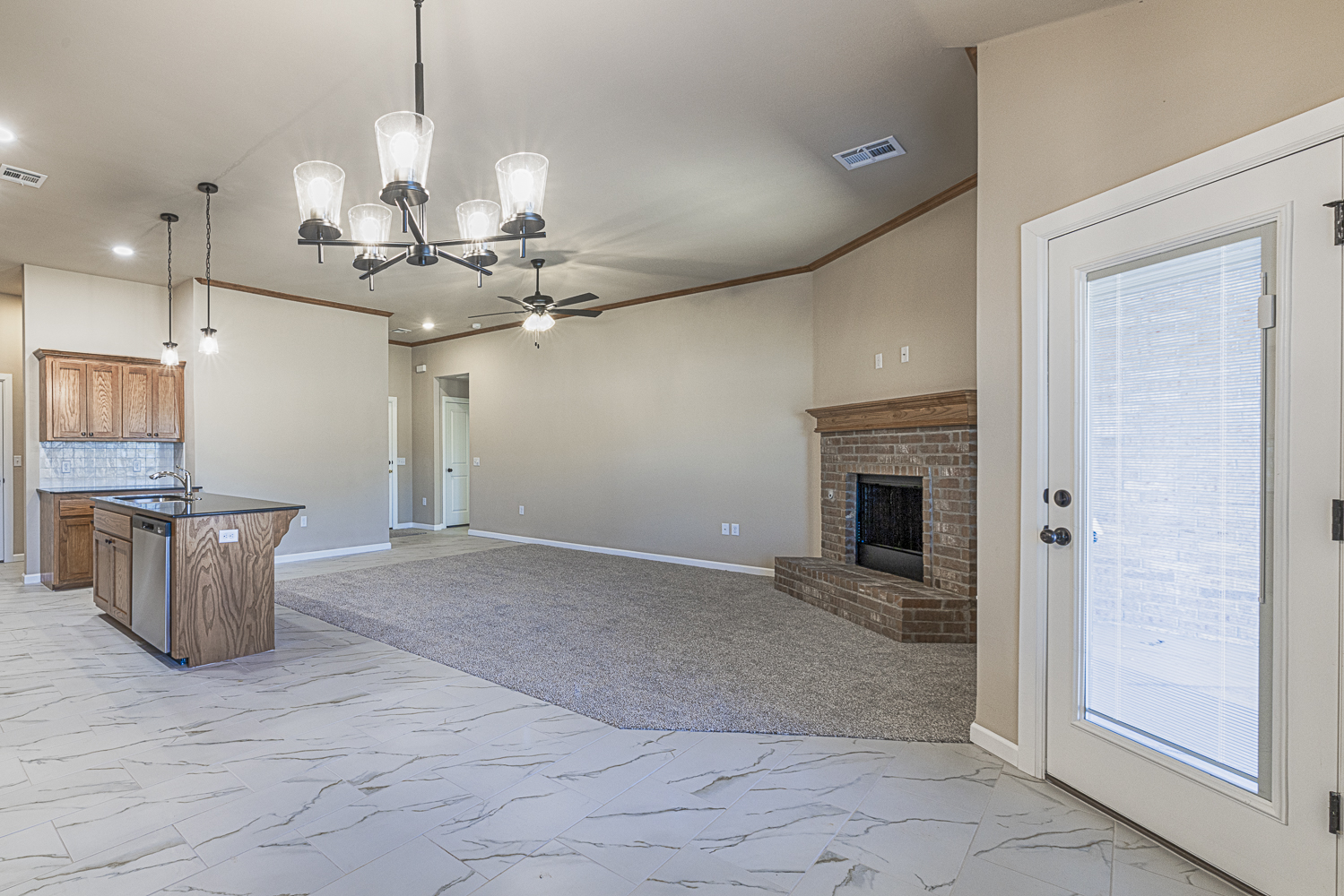 The living room is centered around a classic brick fireplace, creating a warm focal point for relaxing evenings or gatherings with friends and family.