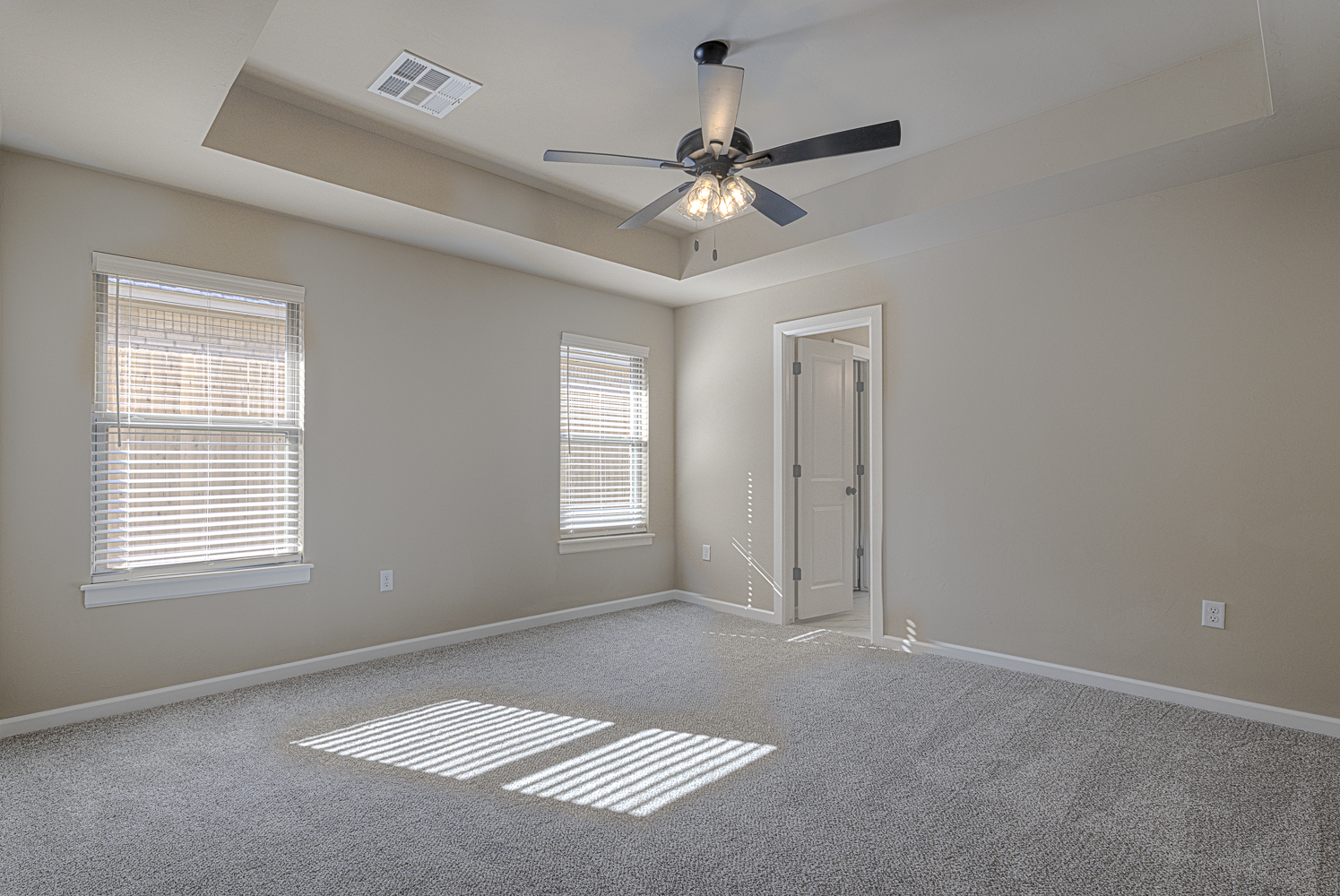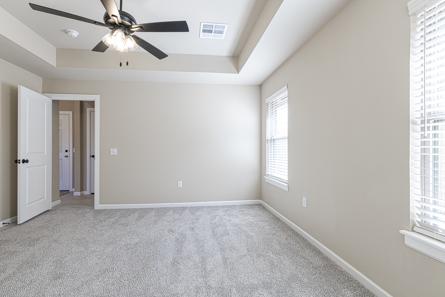 The spacious primary bedroom retreat offers a peaceful place to unwind, highlighted by a vaulted ceiling and ceiling fan.