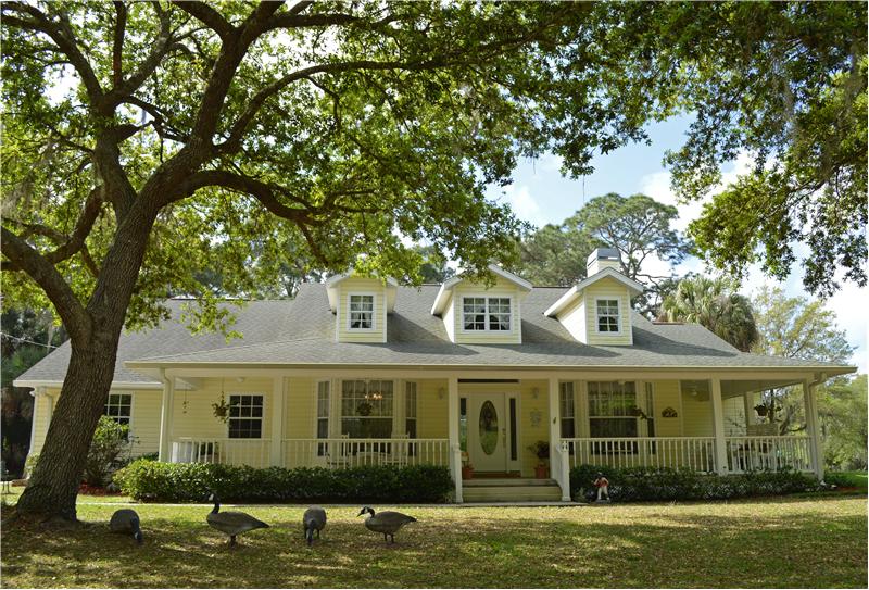 Discover this one-of-a-kind opportunity. This custom, one-owner home offers the best of both worlds. Rarely do you find an attractive, charming, home that is designed for Florida living. Hidden inside the look of a two-story frame house is a one-story block home. Your family and friends will be warmly greeted by the gathering room with fireplace. You will love the 3 bedroom split plan, with master suite, a guest wing, a separate den, an open kitchen with breakfast nook, formal dining and a lovely lanai with pool. There is an attached two-car garage PLUS a detached 3 car garage.