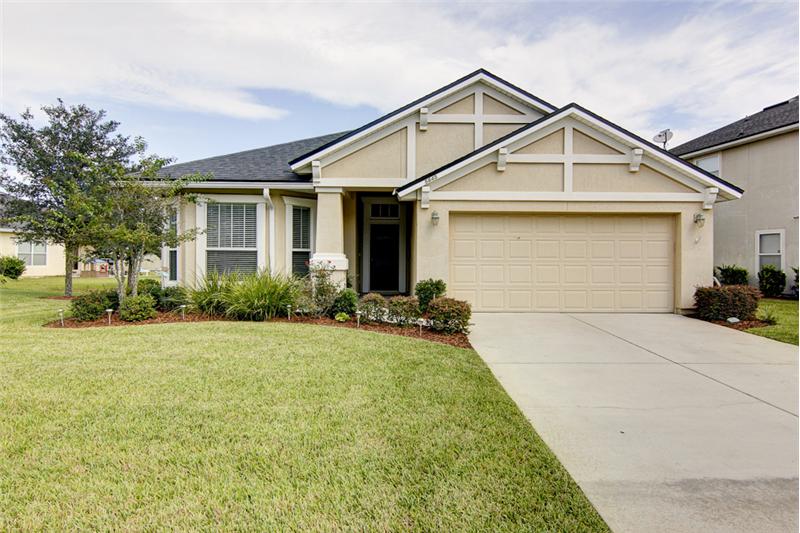 MLS# 738037 Step inside this stunning 3/2 with waterfront view. Ceramic Tile greets you at entry and extends throughout Kitchen, Dining and Wet Areas. Arching entries; extra height ceiling in all rooms. Solid Surface Counters, undermount Sink, stainless appliances. 42'' cabinets, deep food pantry & inset lighting. Working Island with bar height seating. Upgraded lighting in dining room. French door entry to flex space; currently used as office. Front 2 Guestrooms include deep closets, arching ceilings, extra storage above closet. Split floor plan, Master features water views. Lots of room in master bath, garden tub, sep stall shwr, toilet closet & raised vanity. Covered Lanai has been extended; fan; gutters; front/back irrigation. Home wired for security. A Schools! Bartram Elementary in Community!