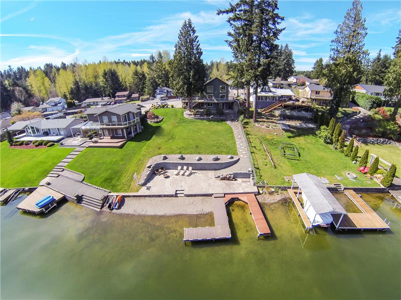Beautiful waterfront home on Lake Tapps! 4 bedrooms, 3 bathrooms on over 1/4 acre! 70+ Sq. Ft. of waterfront, huge dock, concreted bulkhead spans nearly the full width of property-Perfect for entertaining! Home has TWO full kitchens-1 on main & 1 on lower. Home features vaulted ceilings that allows maximum natural light. 1 guest bedroom/studio has its own access above garage. Brand new paint throughout! Ready for you to enjoy this summer!