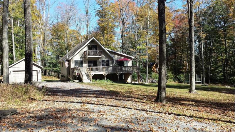 This COMPLETELY remodeled Chalet flows with its open floor plan situated on 3.23 acres. Hardwood floors throughout, granite counter tops, custom breakfast bar, gas fireplace in both dining and living rooms and mountain bike trails throughout the property, as well as river access for fishing, kayaking, and stand up paddle boarding. Secluded yet 3 miles from interstate 84, Hamlin and Lake Wallenpaupack. This space BOTH inside and out reflects room for entertaining and outdoor fun for all. A turn key, move right in must see Chalet! Boat slip available too at Driftwood Cove Marina!