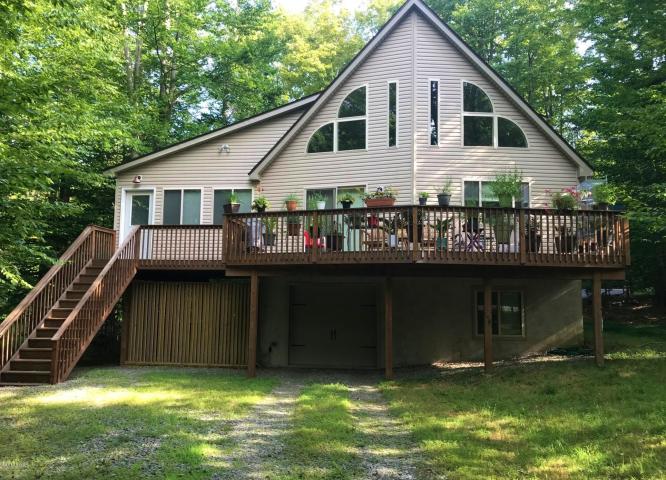 Nestled in the trees, this 4 bedroom 2 bath chalet features a living room with cathedral ceilings and unique windows to let the sun shine in. The dining room has plenty of space for large family meals and has a breakfast counter large enough for everyone to gather around. There is a spacious kitchen with plenty of room to cook for the holidays. The large front deck is a great place to watch the leaves change color and smell the crisp fall air. This home has a Florida room which is a lovely place to play games, read, or listen to the rain fall. The main level features spacious master ensuite.