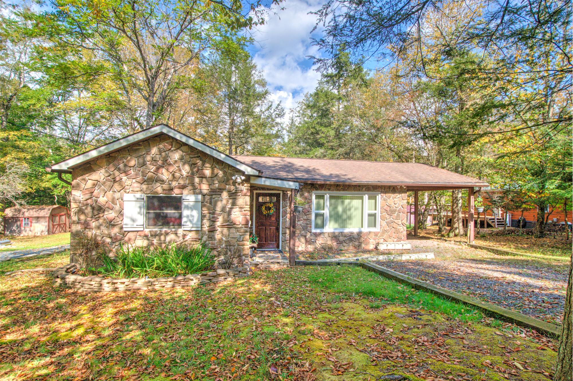 Charming Wallenpaupack Riverfront Cottage with everything you need! This 2 bedroom, 1 bath spacious ranch is the perfect waterfront property on the river and close to the main lake w/flat terrain & 73' frontage! This home comes fully furnished with a boat dock and includes a large dining/kitchen area, family room w/bar, living room 2-propane fireplaces & a partial basement w/laundry area. Plus a covered & screened in porch and a deck. This spacious property includes a 2-car garage, carport, shed & plenty of room to store a boat or toys. Low dues, utility costs & taxes.