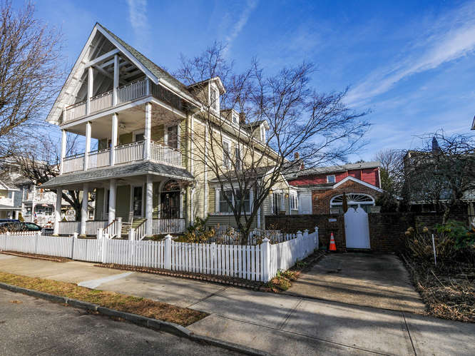 Beautiful home on south east tree-lined corner location. Three floors of living space with formal dining room, large living room with gas stove, 1st floor bedroom/office, new large full bath and newer kitchen that is open to the breakfast room. In-law suite with its own private entrance to English bricked courtyard. Master bedroom with private bath and balcony, family room, hardwood floors, 6 zone central air and 7 zone heat through out, large bedrooms and add'l renovations made recently. The house on a double lot that is only three blocks to the beach, off street parking. 5 large porches