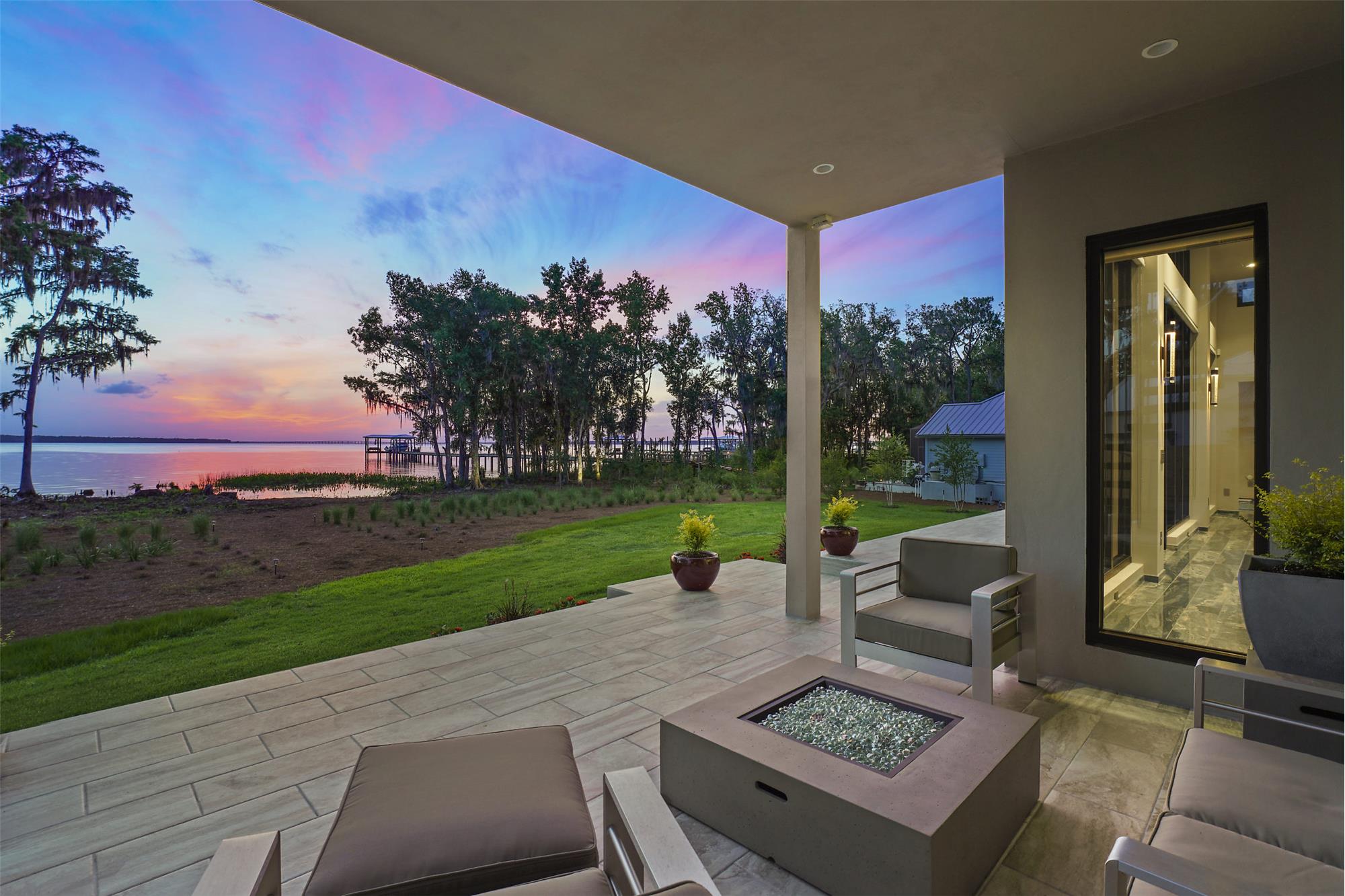· Vestibule entrance with private entrance onto covered lanai and seating area around gas firepit and river views