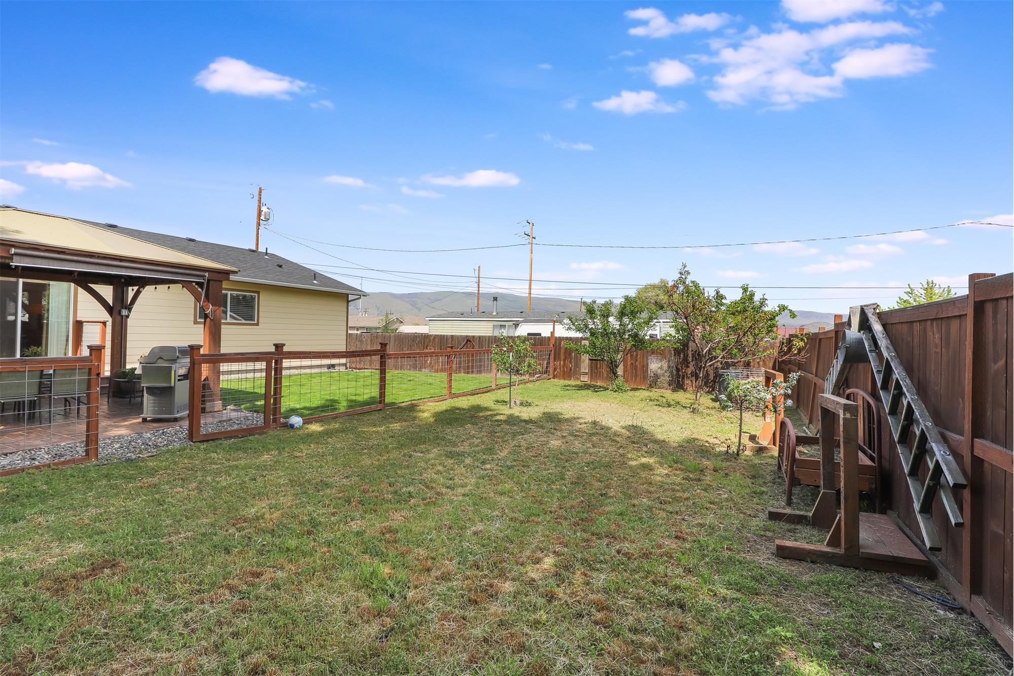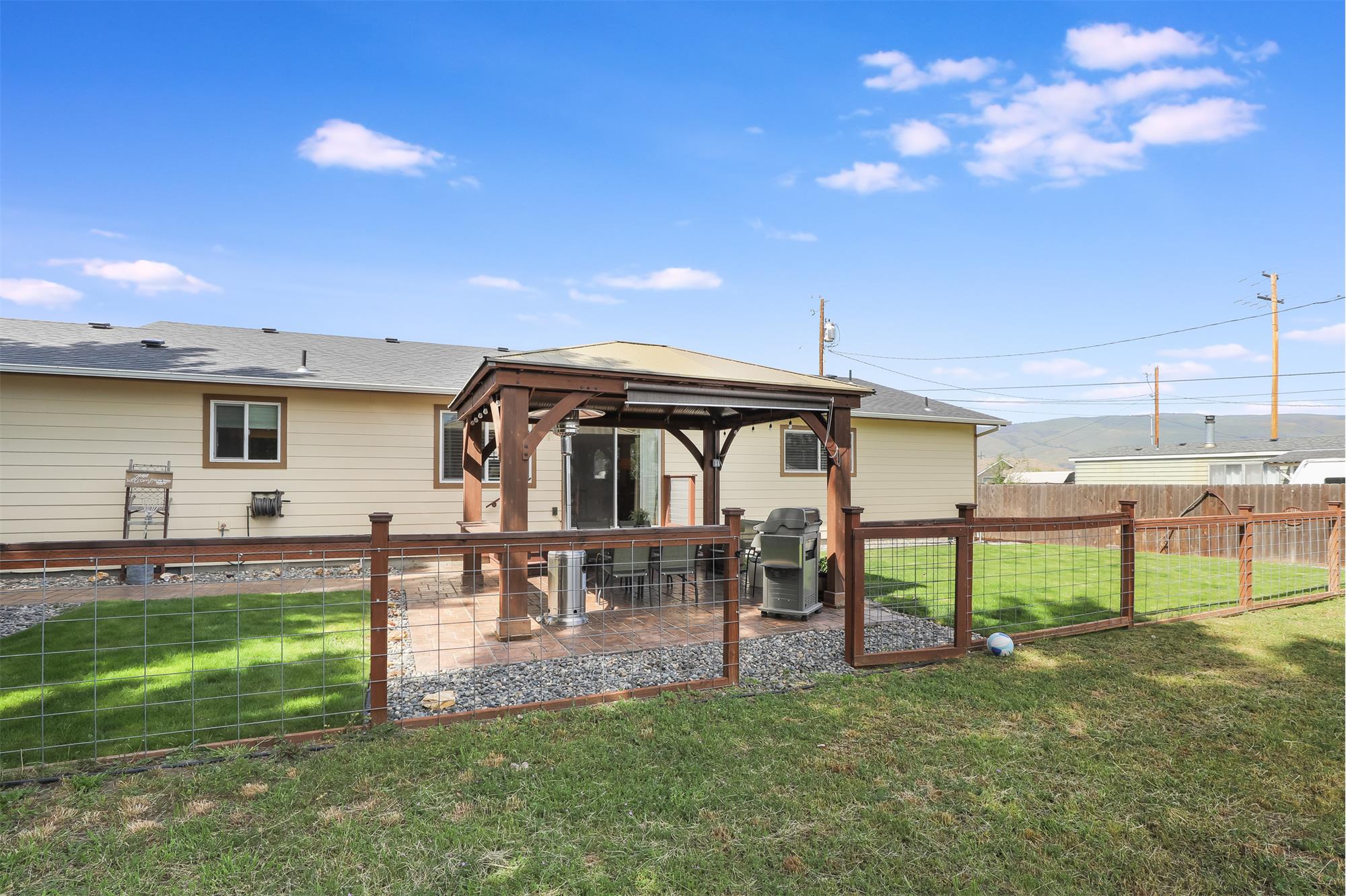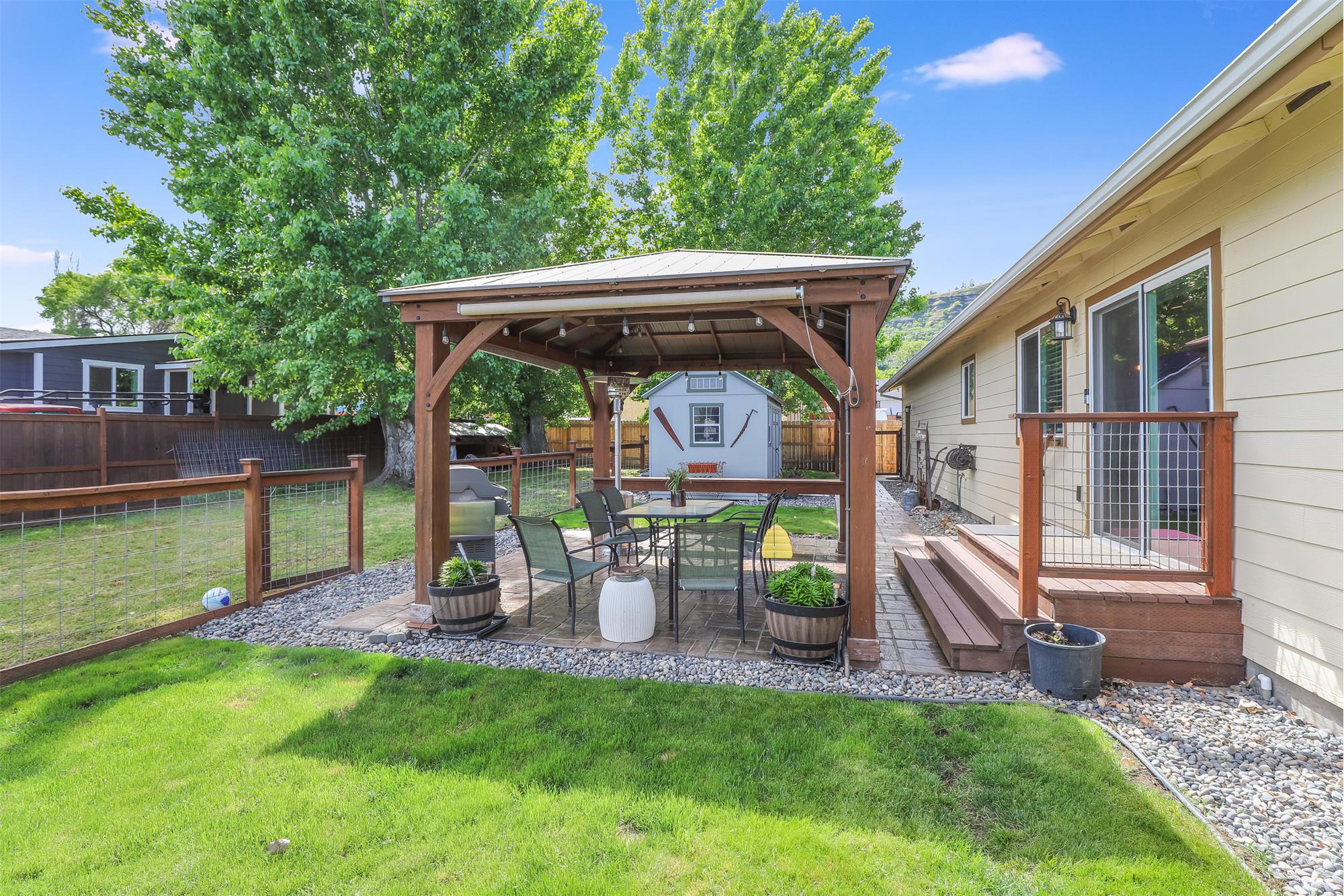 This beautifully maintained single-level home offers comfort, functionality, and thoughtful upgrades throughout. The 1,644 sq ft layout features 3 bedrooms and 2 bathrooms, all designed with ease of living in mind, including just one small step up into the home. Vaulted ceilings enhance the sense of openness and natural light, adding to the home’s inviting feel. Inside, you’ll find a semi-open floor plan with an extra-wide hallway that creates a greater sense of space and accessibility.The kitchen stands out with two-tone cabinetry, copper accents, and a decorative tin copper penny backsplash that adds warmth and character. The primary suite includes a private ensuite bath with a brand-new step-in shower, while two generously sized guest bedrooms provide flexibility for family, visitors, or a home office. At the end of the hallway, a dedicated laundry room adds everyday convenience. The oversized lot is fully fenced with wood privacy fencing, creating a peaceful outdoor retreat. The backyard is thoughtfully landscaped with a lawn bordered by river rock, a stained and stamped concrete patio and walkway, and a charming wood-framed gazebo complete with string lights and roller shades, perfect for relaxing or entertaining. A tool shed adds convenience, while a separate fenced area offers space for a dog run or garden. You’ll also enjoy the backyard orchard featuring apple, apricot, peach, and plum trees, bringing seasonal beauty and fresh fruit right to your backyard. With an attached garage and evident pride of ownership throughout, this home is a standout opportunity.