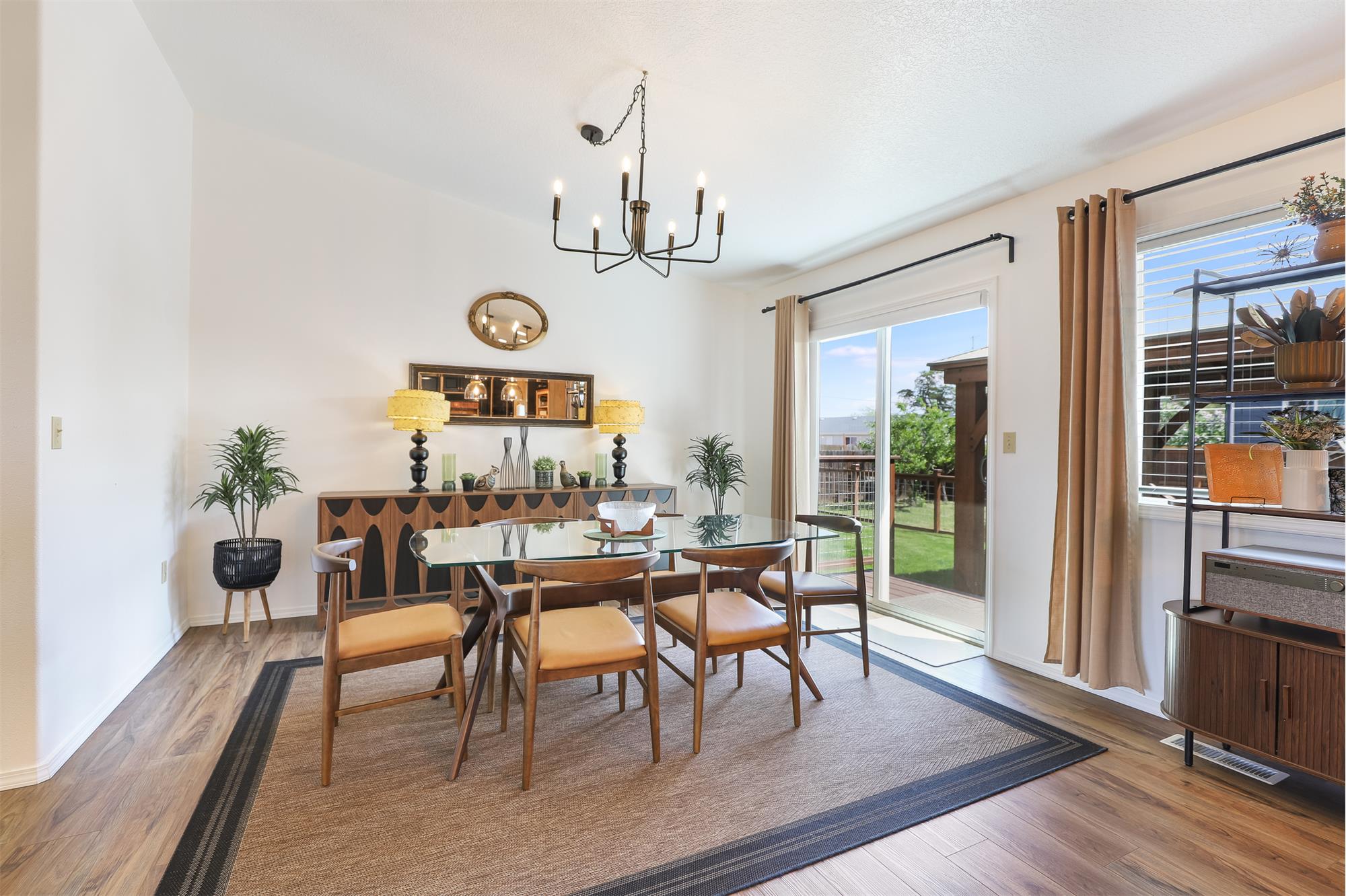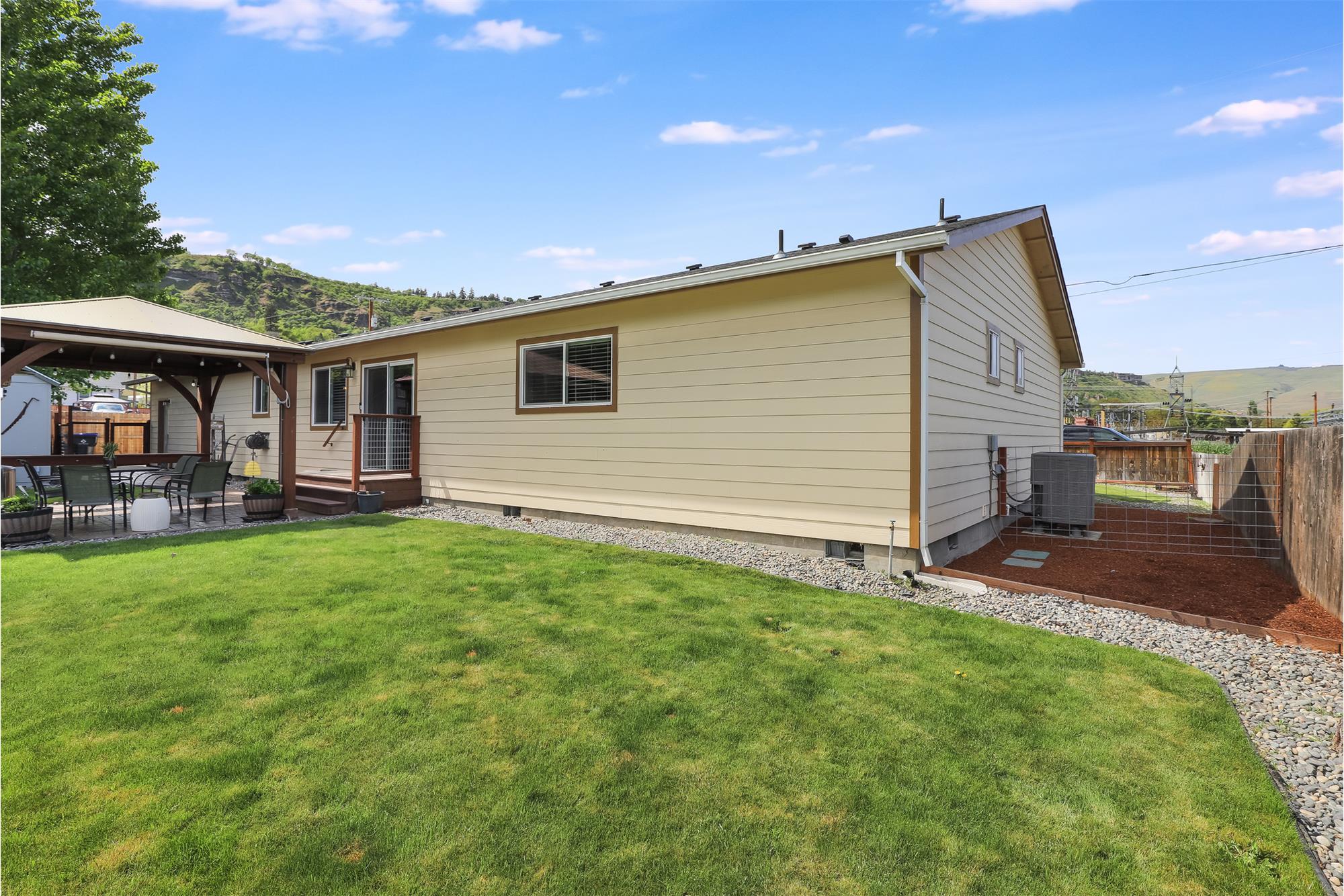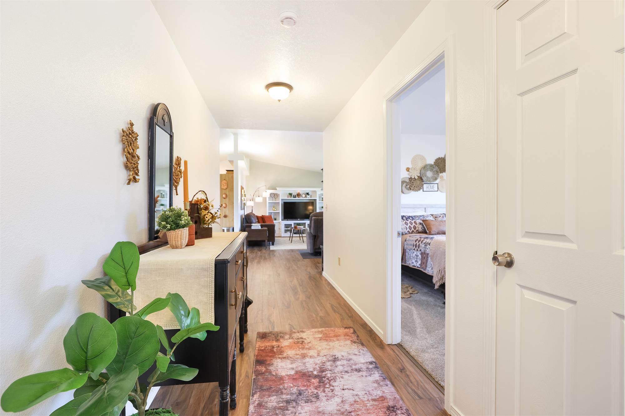 This beautifully maintained single-level home offers comfort, functionality, and thoughtful upgrades throughout. The 1,644 sq ft layout features 3 bedrooms and 2 bathrooms, all designed with ease of living in mind, including just one small step up into the home. Vaulted ceilings enhance the sense of openness and natural light, adding to the home’s inviting feel. Inside, you’ll find a semi-open floor plan with an extra-wide hallway that creates a greater sense of space and accessibility.The kitchen stands out with two-tone cabinetry, copper accents, and a decorative tin copper penny backsplash that adds warmth and character. The primary suite includes a private ensuite bath with a brand-new step-in shower, while two generously sized guest bedrooms provide flexibility for family, visitors, or a home office. At the end of the hallway, a dedicated laundry room adds everyday convenience. The oversized lot is fully fenced with wood privacy fencing, creating a peaceful outdoor retreat. The backyard is thoughtfully landscaped with a lawn bordered by river rock, a stained and stamped concrete patio and walkway, and a charming wood-framed gazebo complete with string lights and roller shades, perfect for relaxing or entertaining. A tool shed adds convenience, while a separate fenced area offers space for a dog run or garden. You’ll also enjoy the backyard orchard featuring apple, apricot, peach, and plum trees, bringing seasonal beauty and fresh fruit right to your backyard. With an attached garage and evident pride of ownership throughout, this home is a standout opportunity.