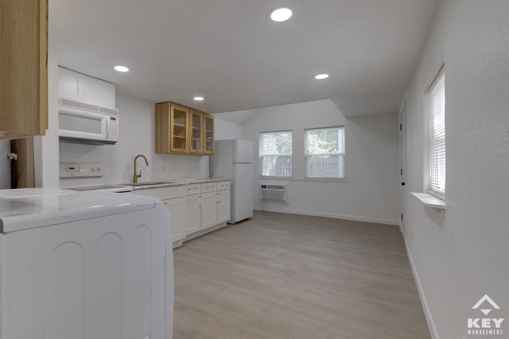 This recently updated one-bedroom house is located south of W 21st St N and east of the Little Arkansas River, accessible from the back lane behind N Jackson Ave. This home features wall-mounted heating and cooling, luxury vinyl plank flooring, recessed lighting, and a kitchen equipped with an oven/range, microwave, refrigerator, and washer and dryer. The layout of this home makes the most of the available space. The kitchen is to the right of the front door, and on the left is the living room, which includes a full bathroom with a shower/tub combo and stairs leading to the loft bedroom. Finally, this home has a privacy-fenced backyard and off-street parking. If this house sounds like somewhere you'd like to make your home, please get in touch with us for showing information. RENT:$750 DEPOSIT: $750 ONE-TIME FEES:$50 per adult application fee, $150 redecoration fee UTILITIES:resident responsible for all utilities. Key Management will never charge a fee to view a home. However, the deposit listed is required to submit an application; any application without a deposit will not be accepted. If your application is not approved, your deposit will be returned to you. However, if your application is approved, you will be notified by telephone and email, at which time the deposit becomes nonrefundable, even if you cancel your move-in. PET POLICY No pets allowed, approved assistance animals only.