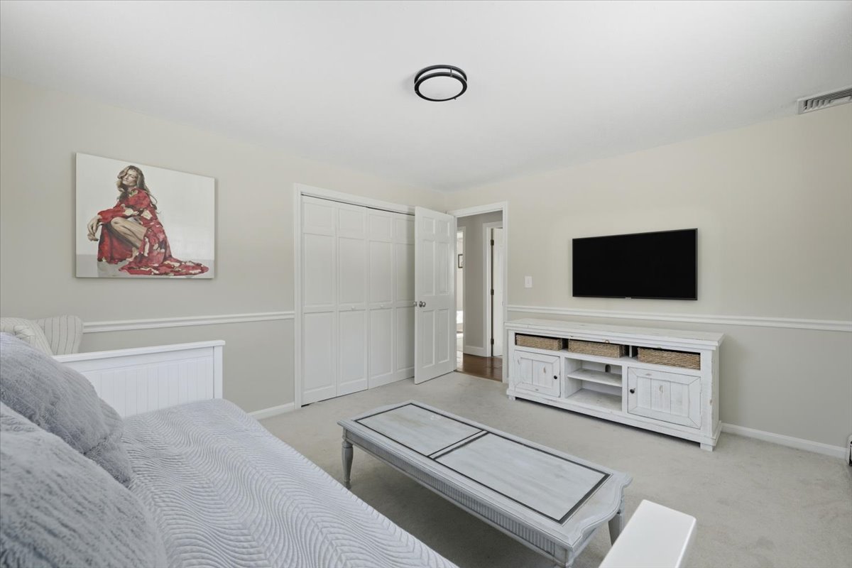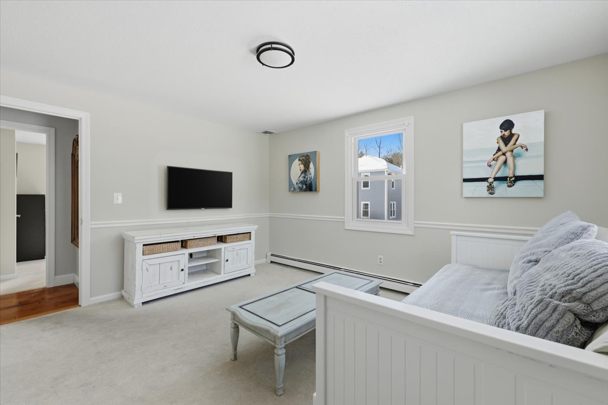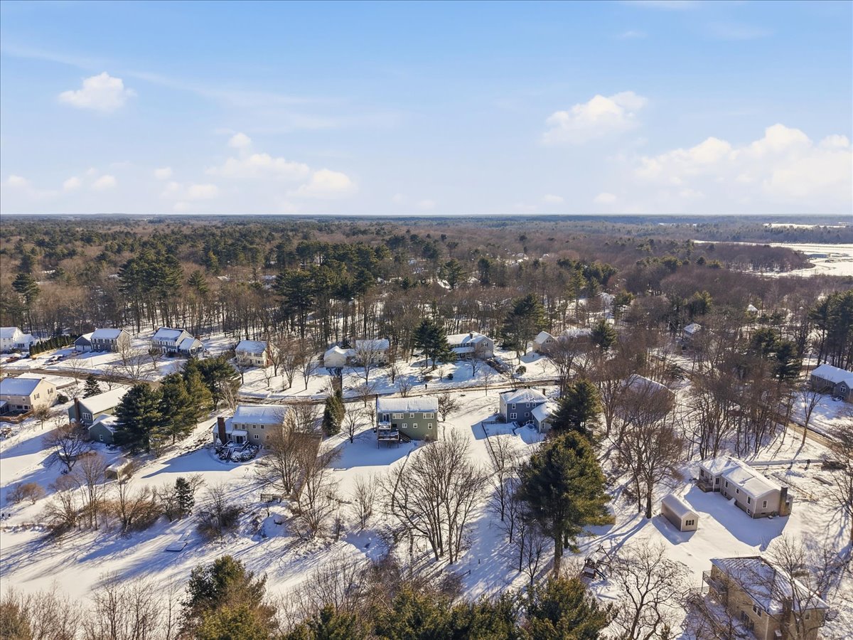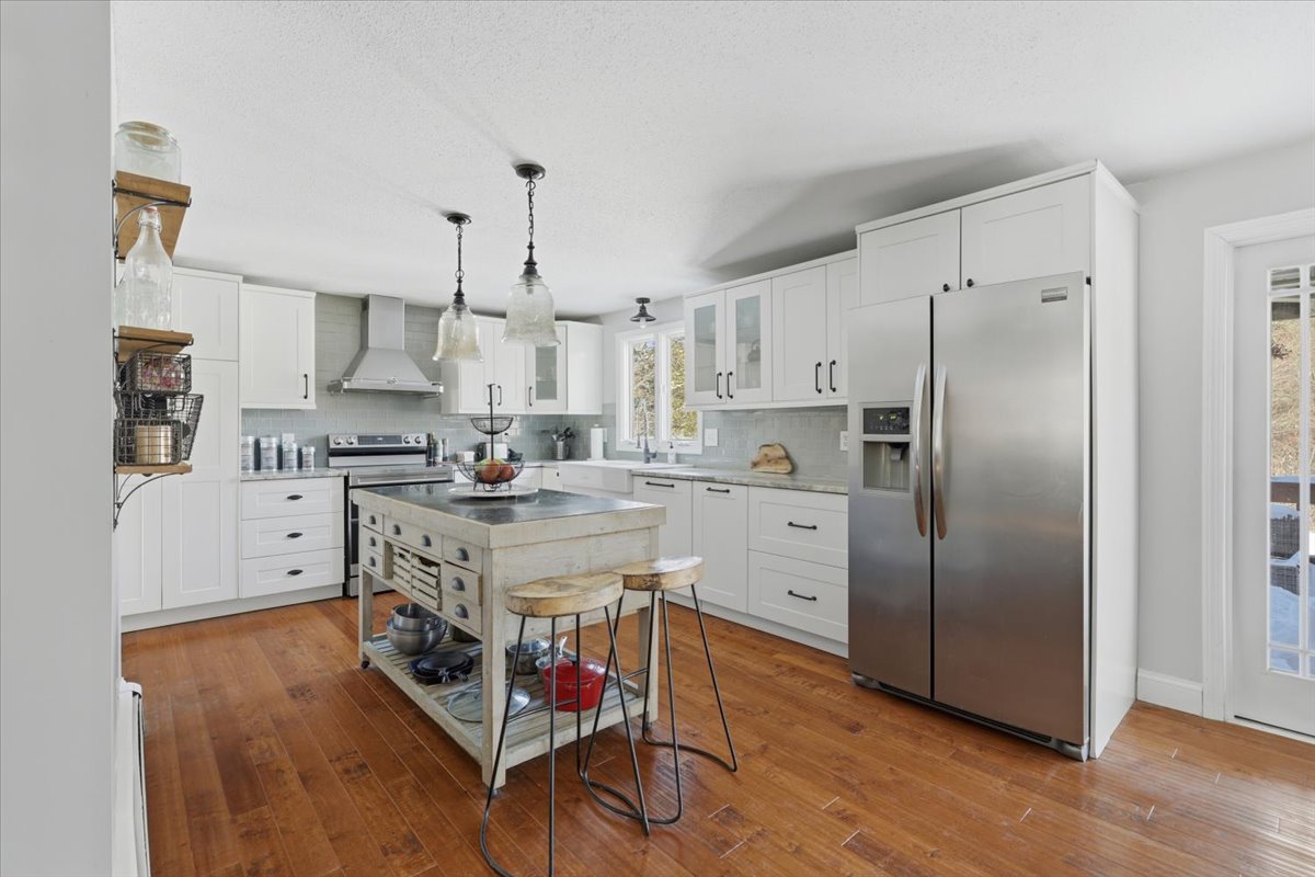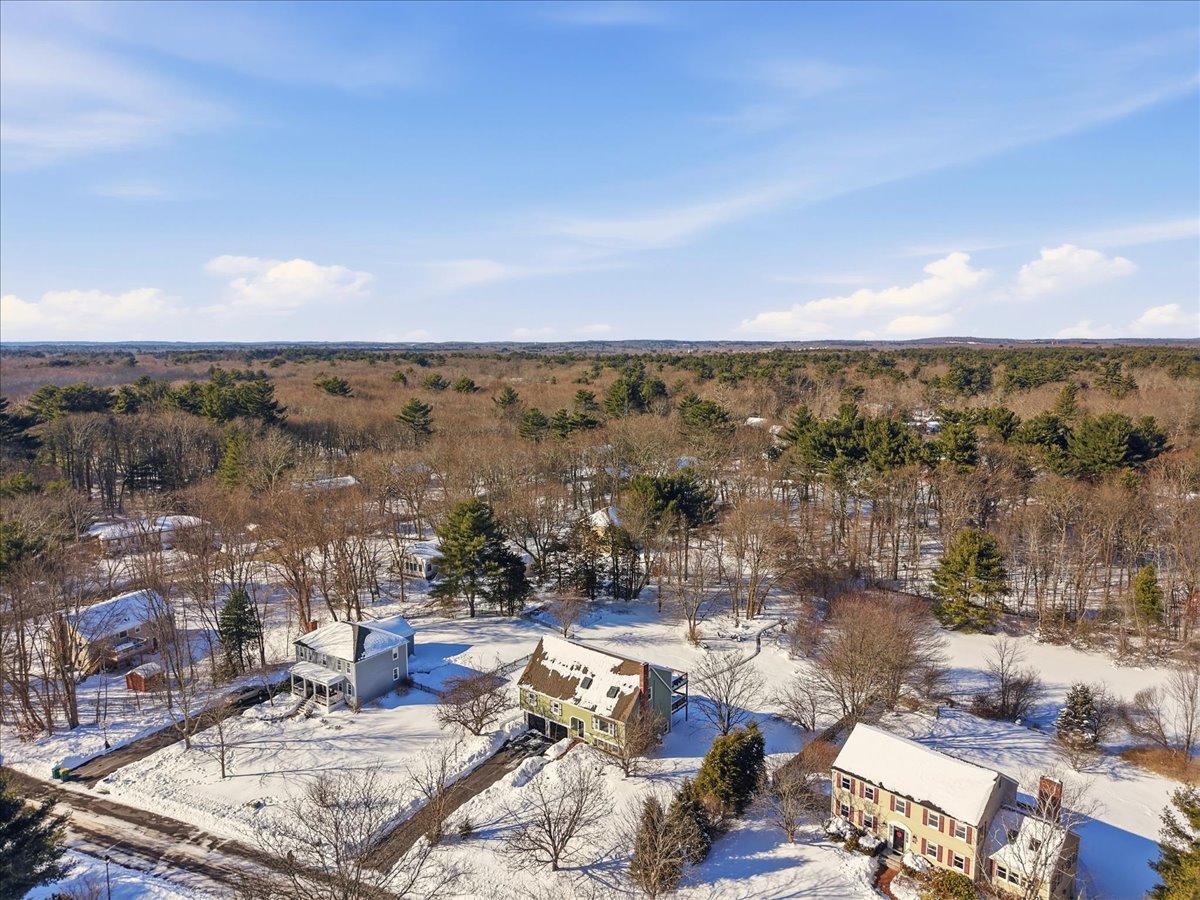 Nestled at 14 Windchime Drive in Mansfield, this lofted-split style home offers a rare opportunity for waterfront living. Set directly on a tranquil pond, the property includes a private dock—ideal for fishing, swimming, kayaking, or simply enjoying the views. Inside, the living room features a striking fireplace, soaring beamed and vaulted ceilings, and skylights that flood the space with natural light. The open-concept layout flows into a well-appointed kitchen with stone countertops, classic shaker cabinetry, a wall chimney range hood, and a center island with breakfast bar. The adjoining dining area and sliding doors lead to an elevated deck overlooking the pond and backyard, creating a seamless indoor-outdoor connection. Three bedrooms and a full bath are located on this level. Upstairs offers an oversized primary suite and a spacious family room, both with access to an additional deck and pond views. A unique blend of comfort, space, and setting in a desirable Mansfield neighborhood.