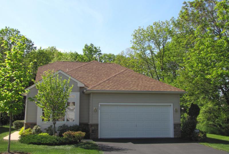 2 bedroom, 2 bathroom ranch home that shows like a model! Open floor plan with hardwood floors and high ceilings. EIK with breakfast bar and dining room. Master bedroom suite has a walk-in closet and a full bathroom. Situated on a cul-de-sac backed by woods. EIK offers 42" glazed cabinets with pull out drawers and glass doors over sink plus stainless steel appliances and under cabinet lighting. Family room features gas fireplace with mantle and french door leading out to patio. Large laundry room with access to 2 car garage with electronic openers. Move in condition. Clubhouse offers a ton of amenities!