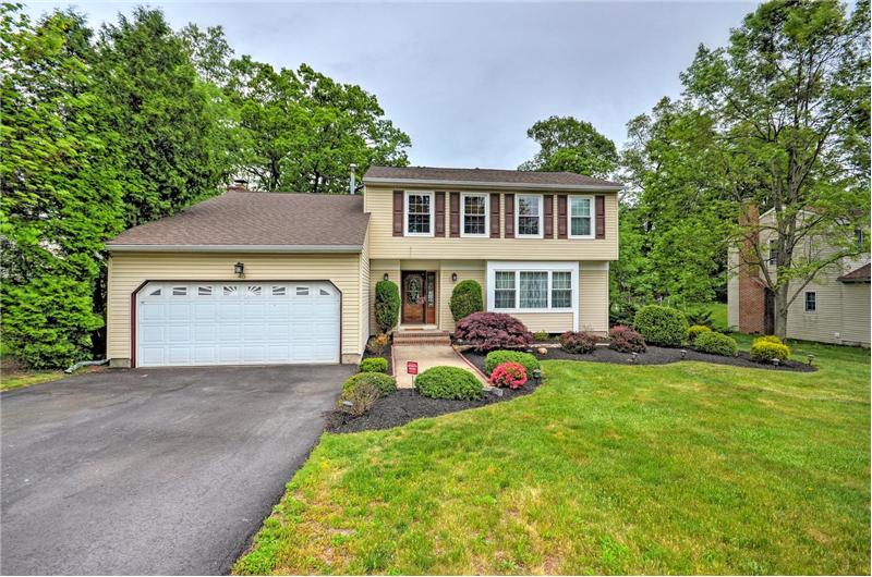 Beautifully updated home in desirable Hickory Knolls community. This 4 bedroom 2.5 bath Colonial/Split features hardwood floors in LR & DR. Kitchen complimented by cherry cabinetry & granite counters! Eat-in kitchen with ceramic tile and glass sliding door leading out to deck and generous yard. Enjoy entertaining in this spacious family room with vaulted ceilings and wood burning fireplace. The master bedroom would not be complete without the private bathroom. Partial basement with utility room & laundry. 2 car attached garage. Fabulous location near many major highways, transportation & shopping. Within an hour to NY, PA & Jersey shore!