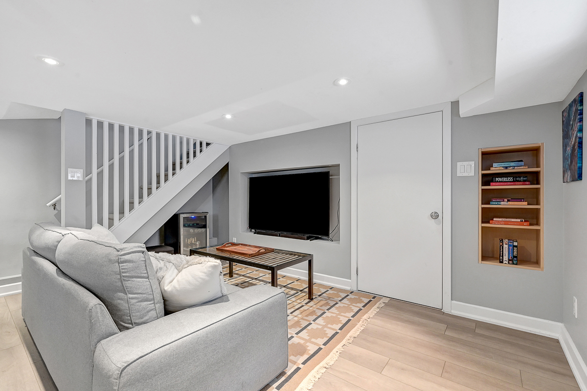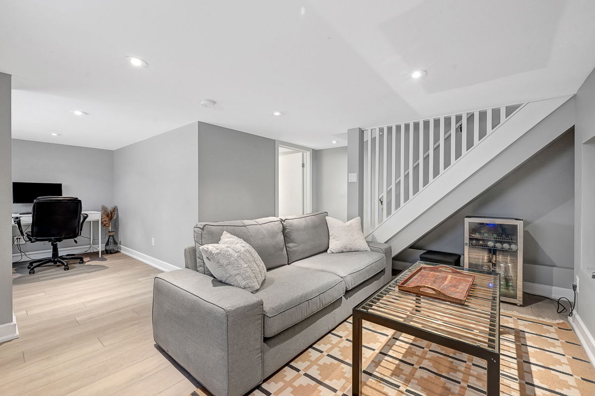 along with a full bathroom. The finished basement expands the living space with a versatile room suitable for a home office, guest space, or