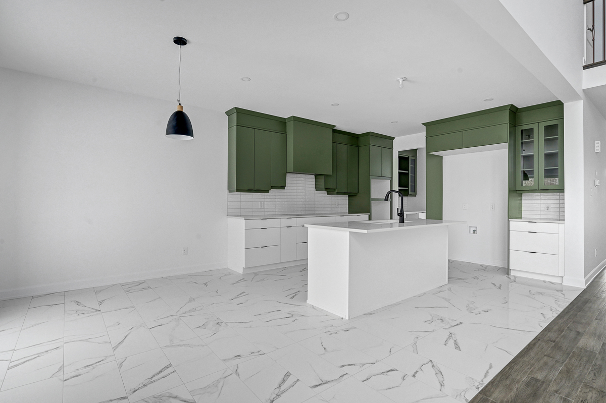 room offer space for any sized dining table. The designer kitchen features loads of cabinet and counter space with quartz counters, a huge
