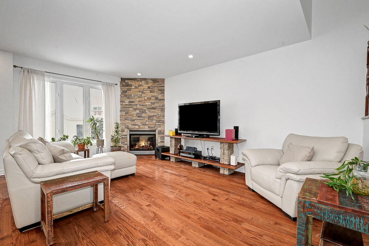 highlighted by a natural gas fireplace with a striking brick accent wall. Oak hardwood flooring extends throughout both levels and the staircase