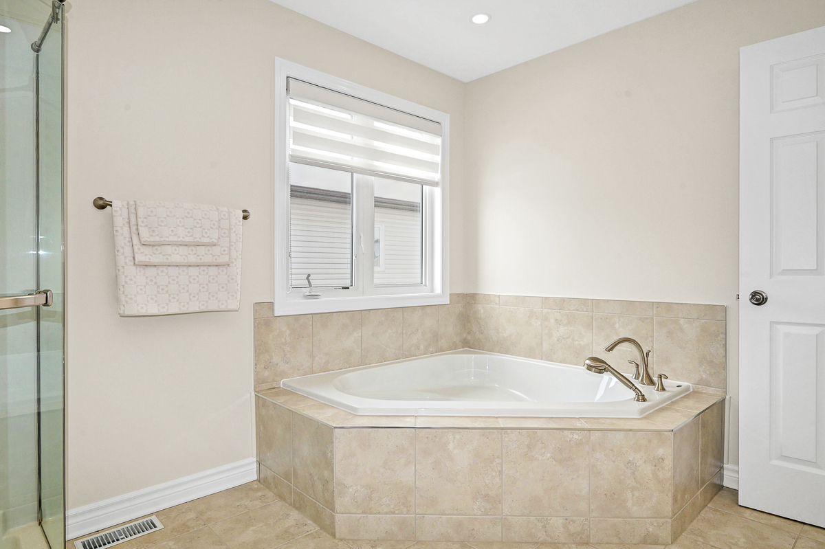 private backyard framed by mature cedar hedges. Built two feet deeper than the original plans, the home offers generously sized living spaces