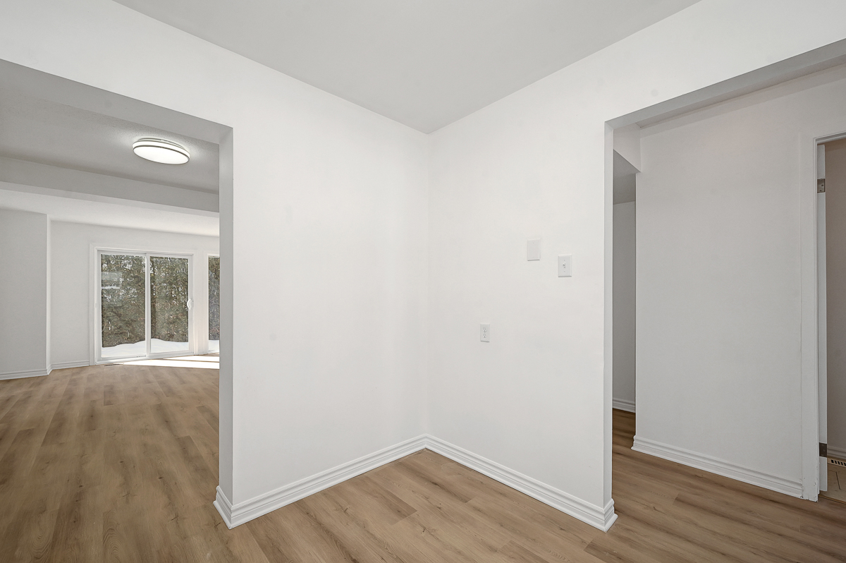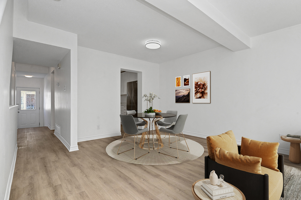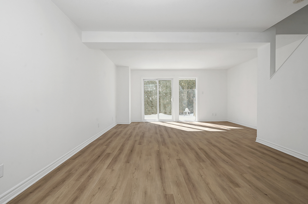 showcases new vinyl plank flooring (2026) and a bright, spacious living and dining area framed by large windows. Sliding patio doors lead