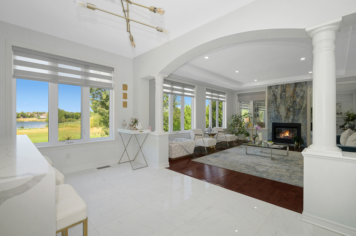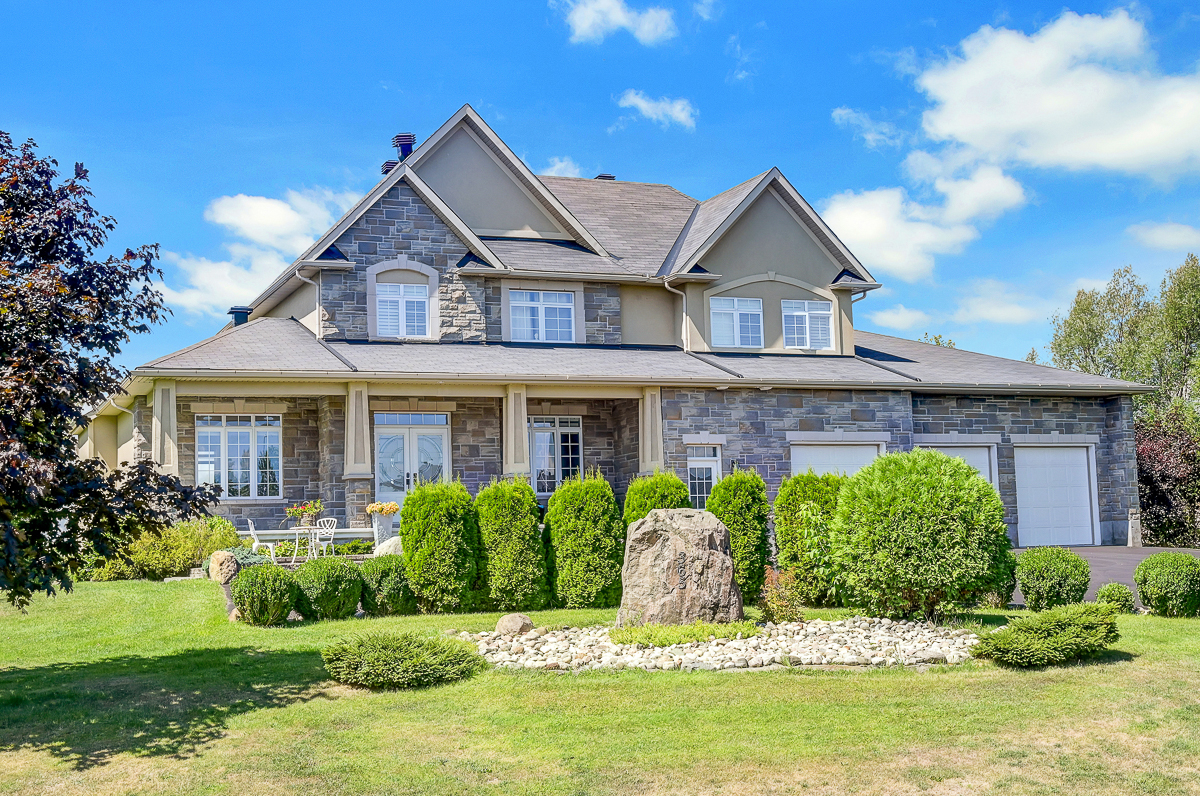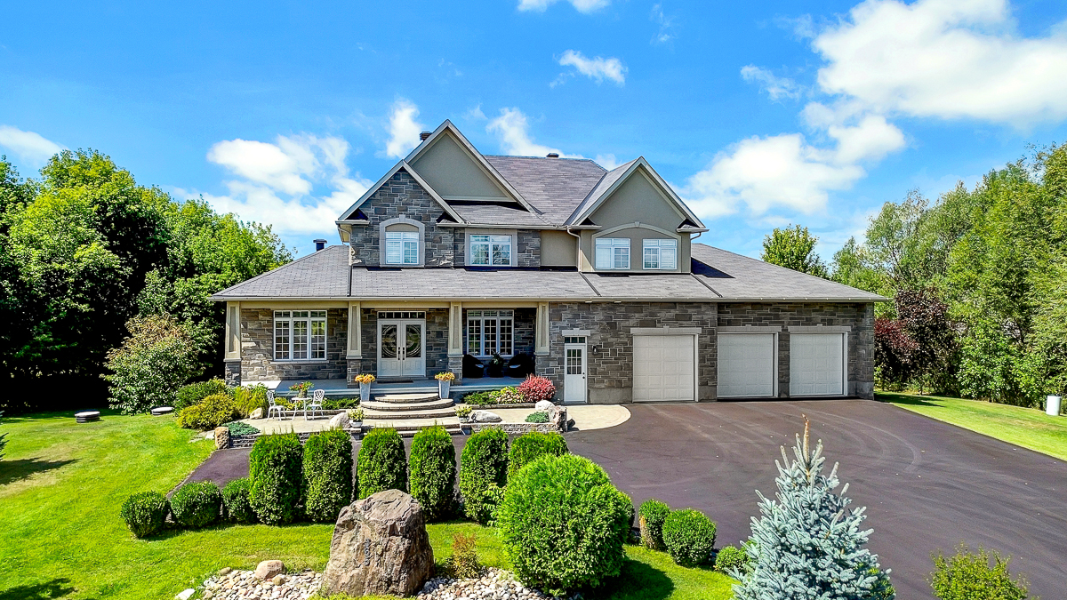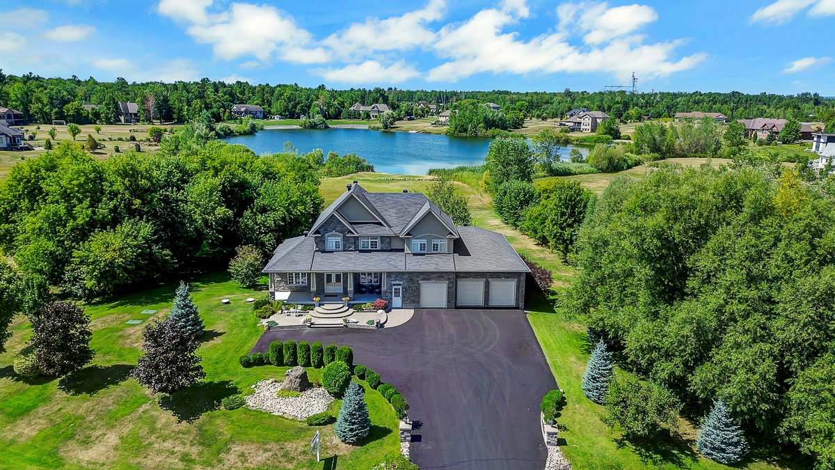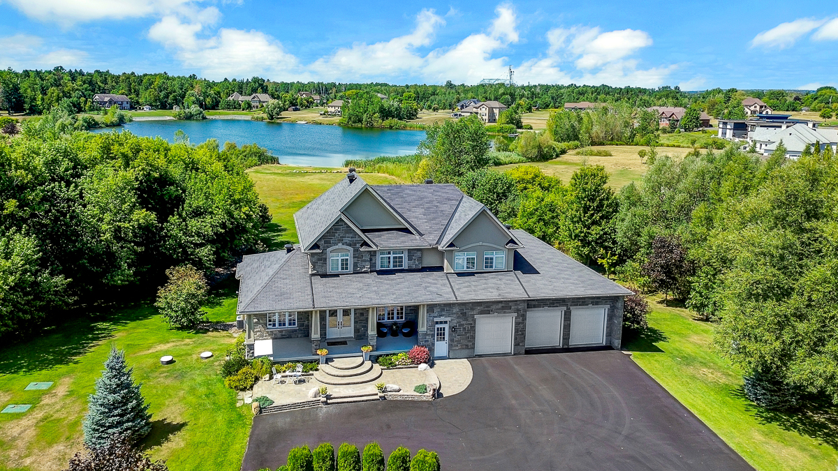Discover the ultimate in waterfront living with this stunning 5 bedroom, 5 bath residence set on a private 2.3 acre lot with over 120 feet of direct lake frontage. Perfectly situated just 10 minutes from Kanata's tech hub, shopping, and dining, and only 5 minutes to the 417 for quick access downtown, in one of the areas most desirable communities. Custom built in 2010, this home offers 5,000 sq ft of finished living space across three levels, and enhanced with more than $500,000 in renovations, it blends timeless craftsman design with modern finishes across three levels of living space and a three car garage. The main floor features expansive living and dining areas with oversized windows framing both front and back views, a chefs kitchen with Calcutta quartz counters and backsplash, white shaker cabinetry, oversized peninsula, and high end appliances, a bright breakfast area, family room with gas fireplace, and a sun filled three season room offering panoramic lake views, along with a dedicated office, oversized mudroom, and convenient laundry with garage access. Upstairs, three suite style bedrooms provide luxury and privacy, including a primary retreat with a spa inspired ensuite boasting a freestanding soaking tub, dual vanities with valence lighting, and a custom glass walk in shower. The fully finished walkout lower level adds versatility with two additional bedrooms, a full bathroom, a spacious recreation room and ample storage. Outdoors, enjoy landscaped grounds with mature trees, a stone patio, pergola, and a fruit bearing orchard, perfect for family gatherings or elegant entertaining. Added features include a 10 zone sprinkler system, wired for GenerLink, 40 amp garage receptacle for EV charging, new furnace, AC, and water heater (all owned), plus an epoxy coated porch. This rare offering in West Lake Estates combines craftsmanship, thoughtful updates, and year round waterfront enjoyment. Annual co-tenancy fee of $100 covers lake maintenance.