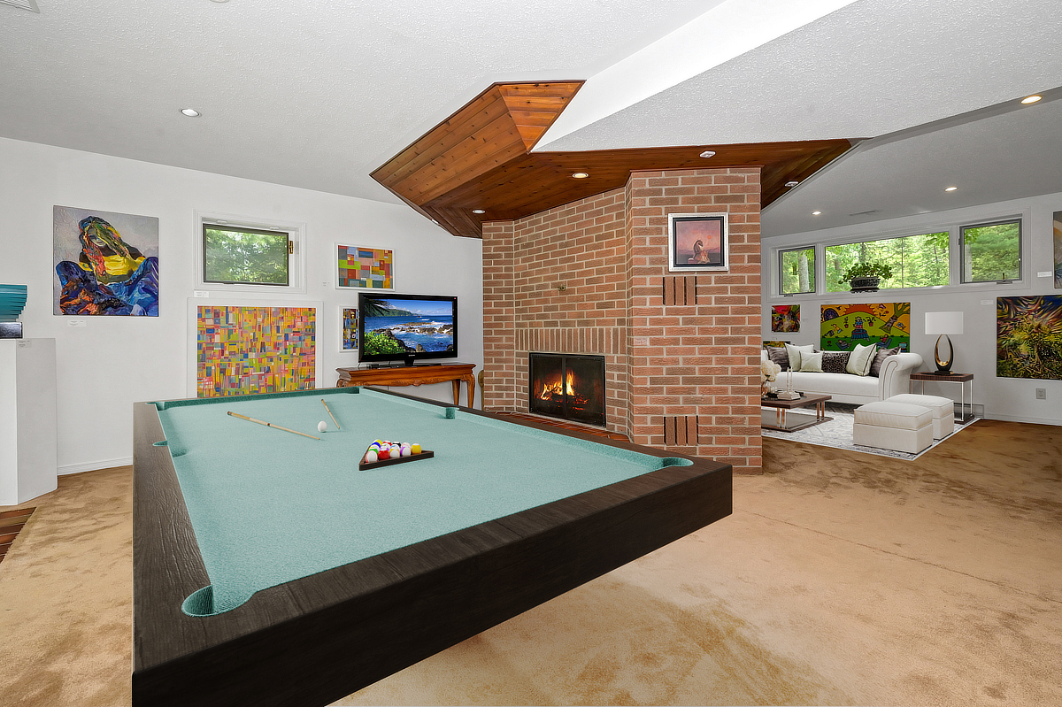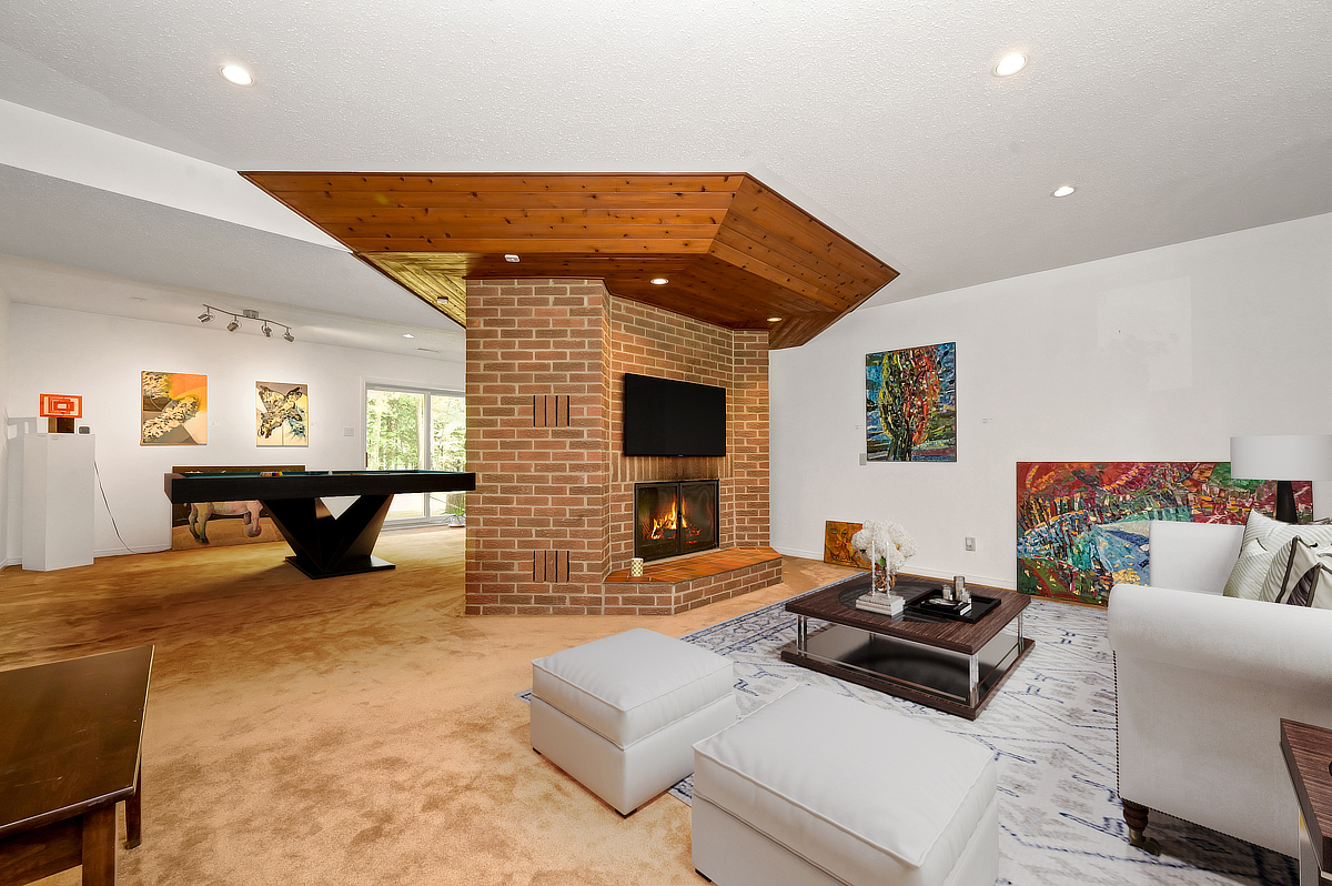 bathroom, a double-sided wood-burning fireplace, and access to a private lower terrace.An oversized wood shed offers excellent storage for