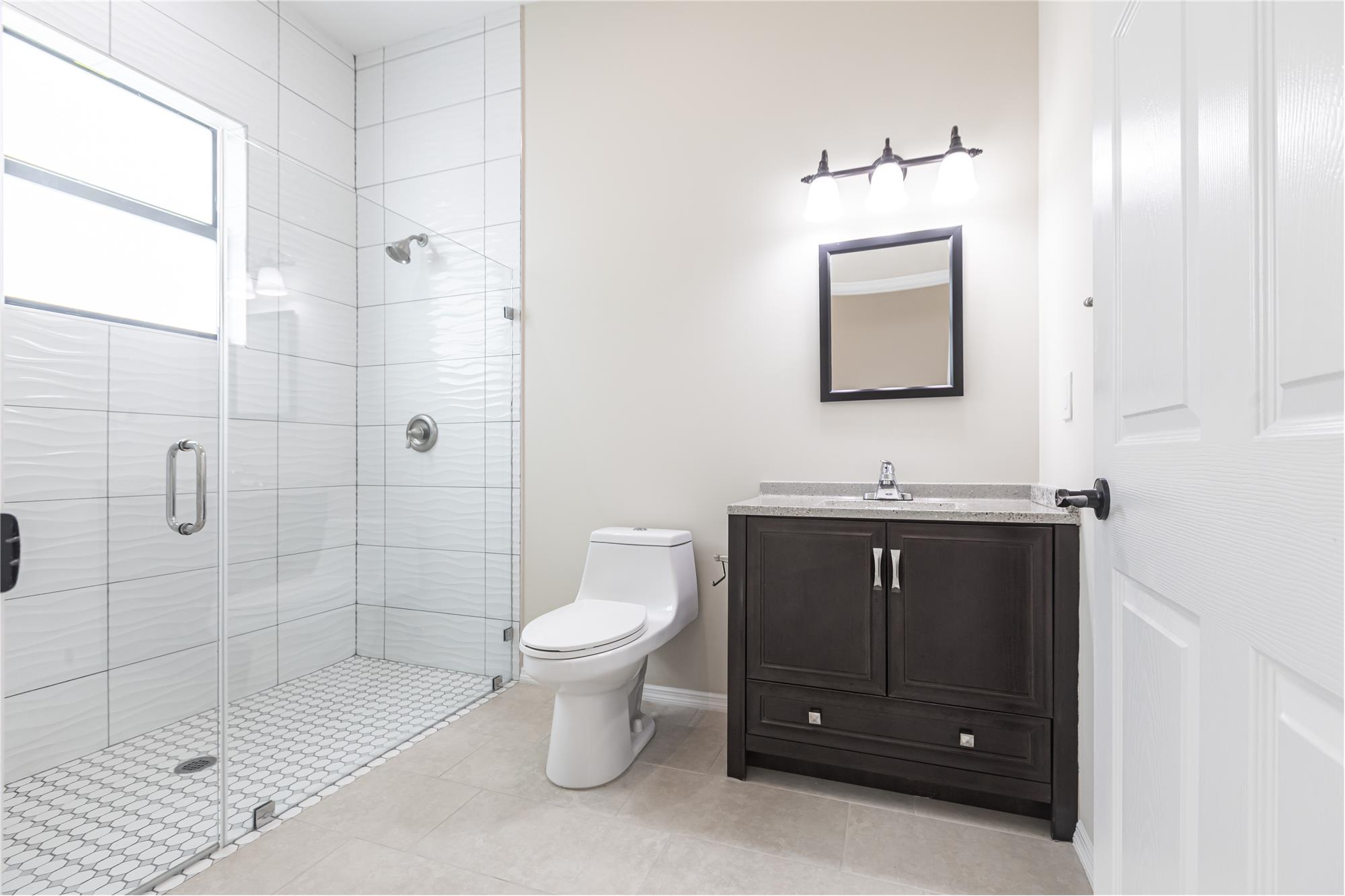 The home includes four large bedrooms, including two master suites ideal for multi-generational living or guests. Each of the four full bathrooms is elegantly designed with walk-in showers, stone countertops, and premium finishes.