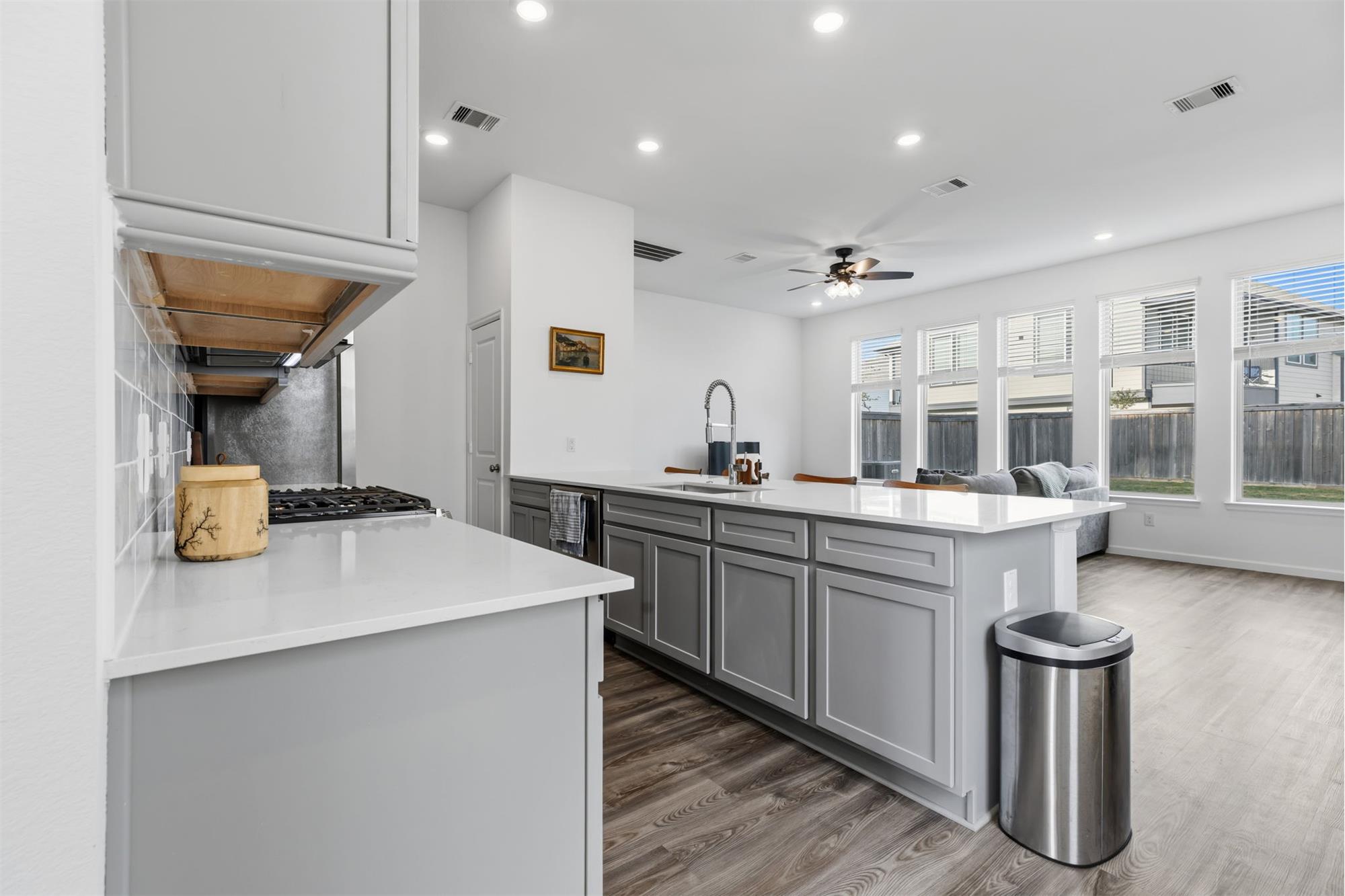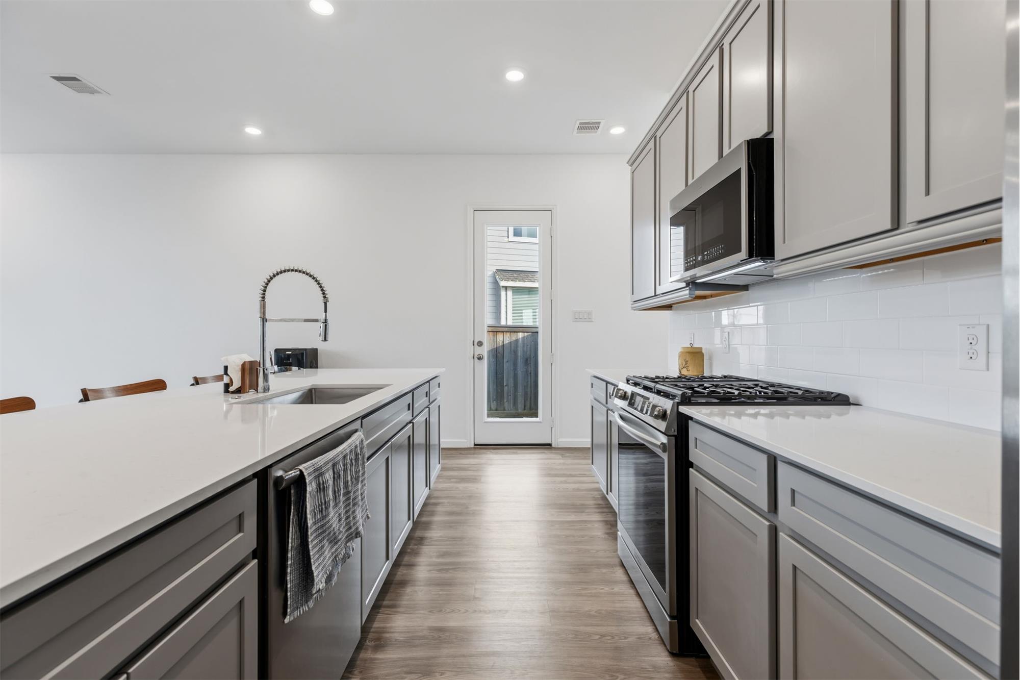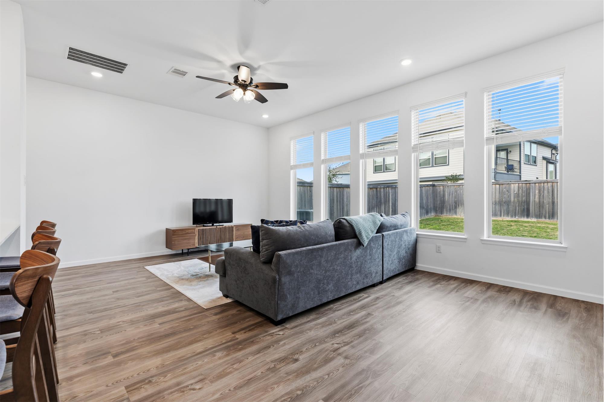 Beautiful move-in ready townhome located across from lake and walking trails! Nice big foyer with mud room as you enter with beautiful luxury vinyl plank floors. Huge living area with wall of nice big windows bring in plenty of natural light. Kitchen is a chefs dream with big island bar open to the living area. Don't miss the big pantry and the extra large storage closet just off the mud room. Primary retreat is nice a big with high vaulted ceilings and en suite bathroom with big walk-in shower and closet. Upstairs there is nice big landing with room for another sitting area, desk or storage plus an extra room! Two more large secondary bedrooms. This home is on an extra large corner lot with no direct backyard neighbors. The new pool and play area are near completion and is located just down the street. HOA includes front and back yard maintenance except flower beds installed by owner in backyard.