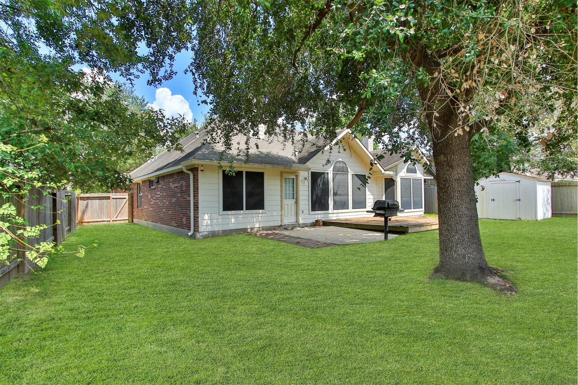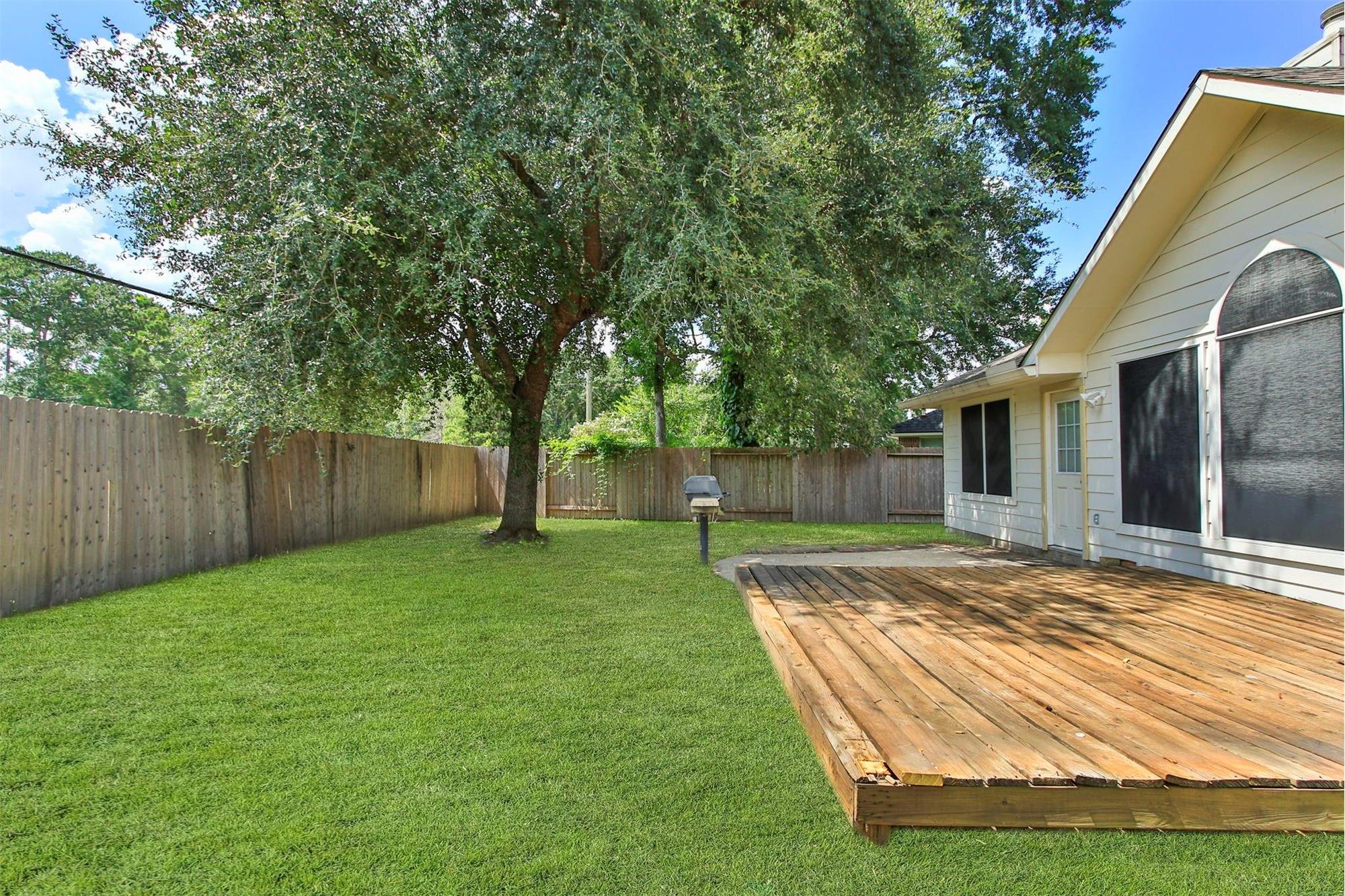 Beautiful one story on a quiet cul-de-sac backs up to a nice big shady green space! There are no back neighbors! 3 bedrooms, 3 full bathrooms plus a study, Extra room, huge living and dining! Big kitchen with soaring high ceiling and a nice big sky light makes it nice & light. The kitchen with gas cooking is fully open to the huge living area with beautiful wood floors, fireplace & high ceilings & energy saving solar screens leads to a big shady back yard with a wood deck and is connected gas grill! Nice big dining area plus an extra room great for game room, extra study or play area! Study is very large located in nice private area in the front of home great for privacy and working from home! Nice big primary with walk-in shower, soaking tub and big walk-in closet! Never flooded. Fresh interior paint, Gutters, water heater and fence 2022.
