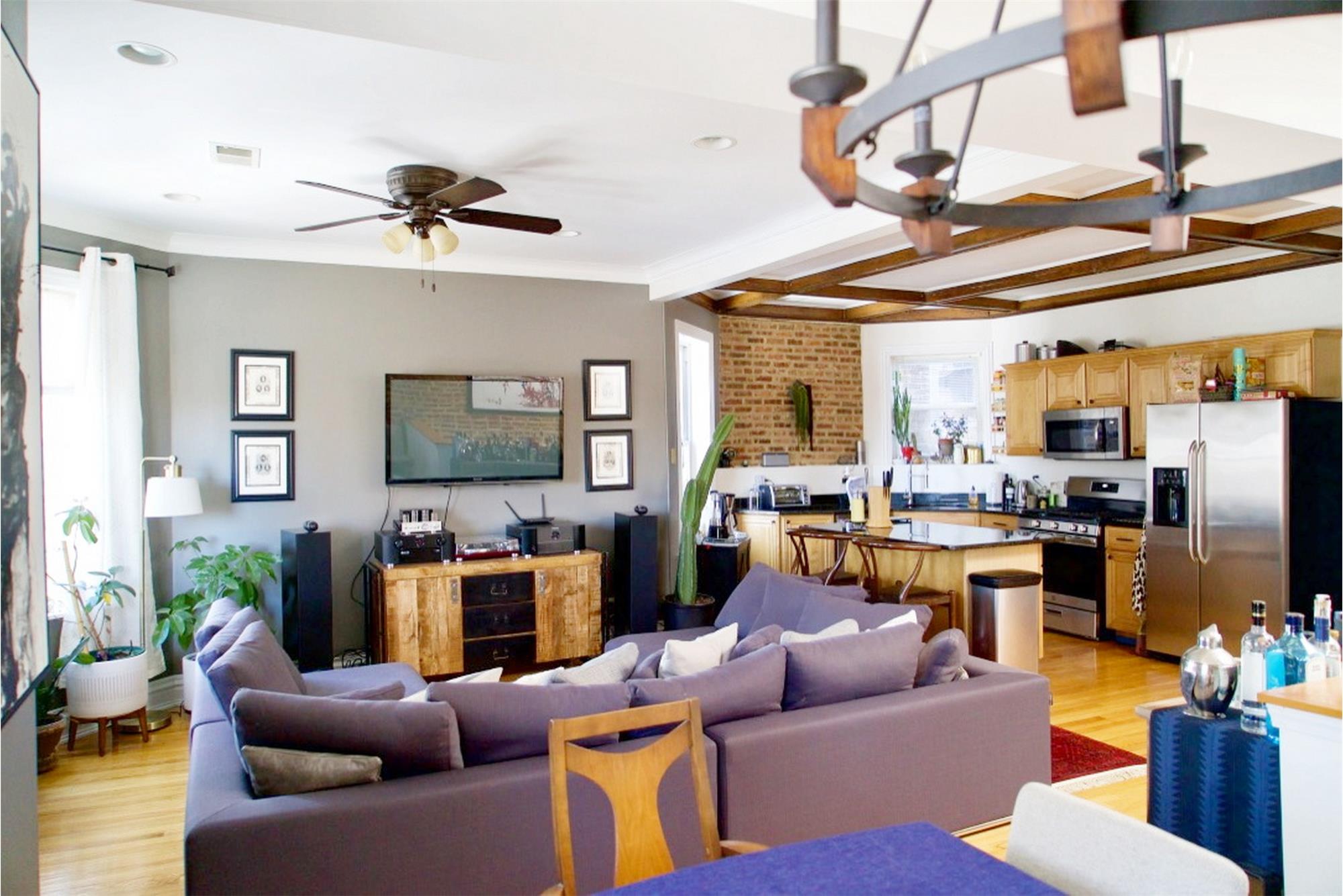 Step inside to a one-of-a-kind, MASSIVE great room featuring exposed brick, a coffered kitchen ceiling, a large skylight, and an expansive living area perfect for relaxing or entertaining while enjoying peaceful treetop views.
