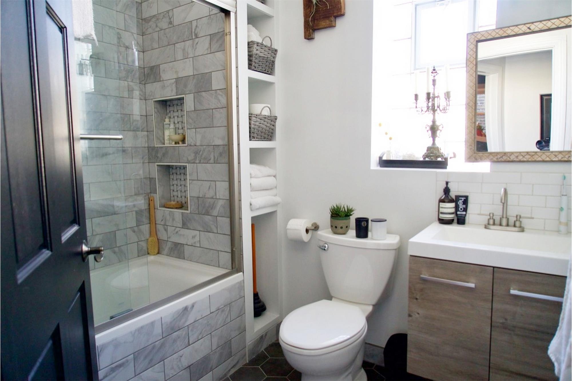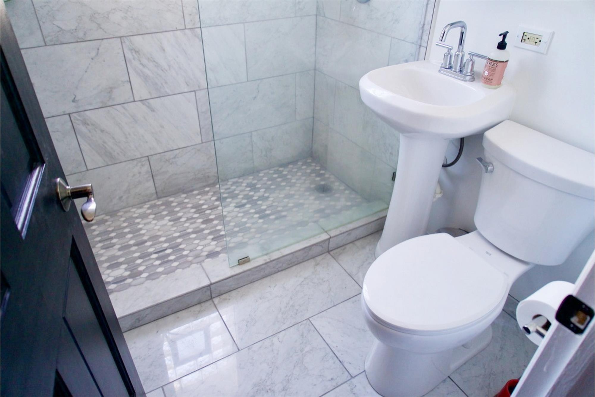 The primary bathroom is fully renovated with: