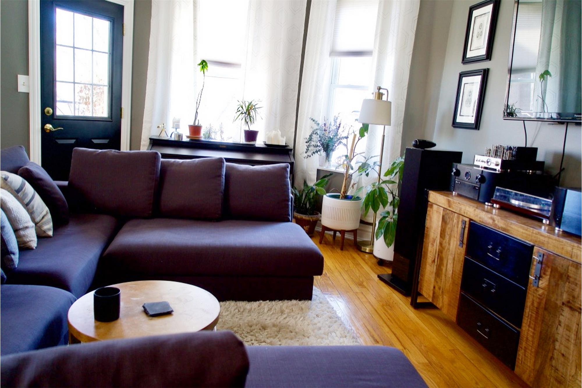 Natural hardwood floors run throughout the living areas. The front two bedrooms (approx. 10' x 11') easily accommodate queen-sized beds with dressers and side tables, and both feature double sliding-door closets.