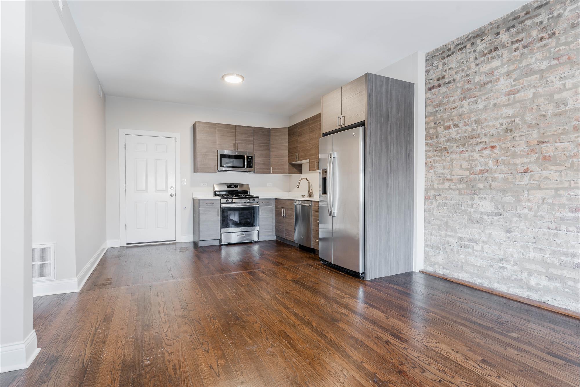 This stunning 3-bedroom, 2-bath apartment perfectly blends vintage charm with modern updates in all the right ways. Located in the heart of Logan Square, this spacious home features exposed brick walls, tall ceilings, and rich dark hardwood floors throughout.