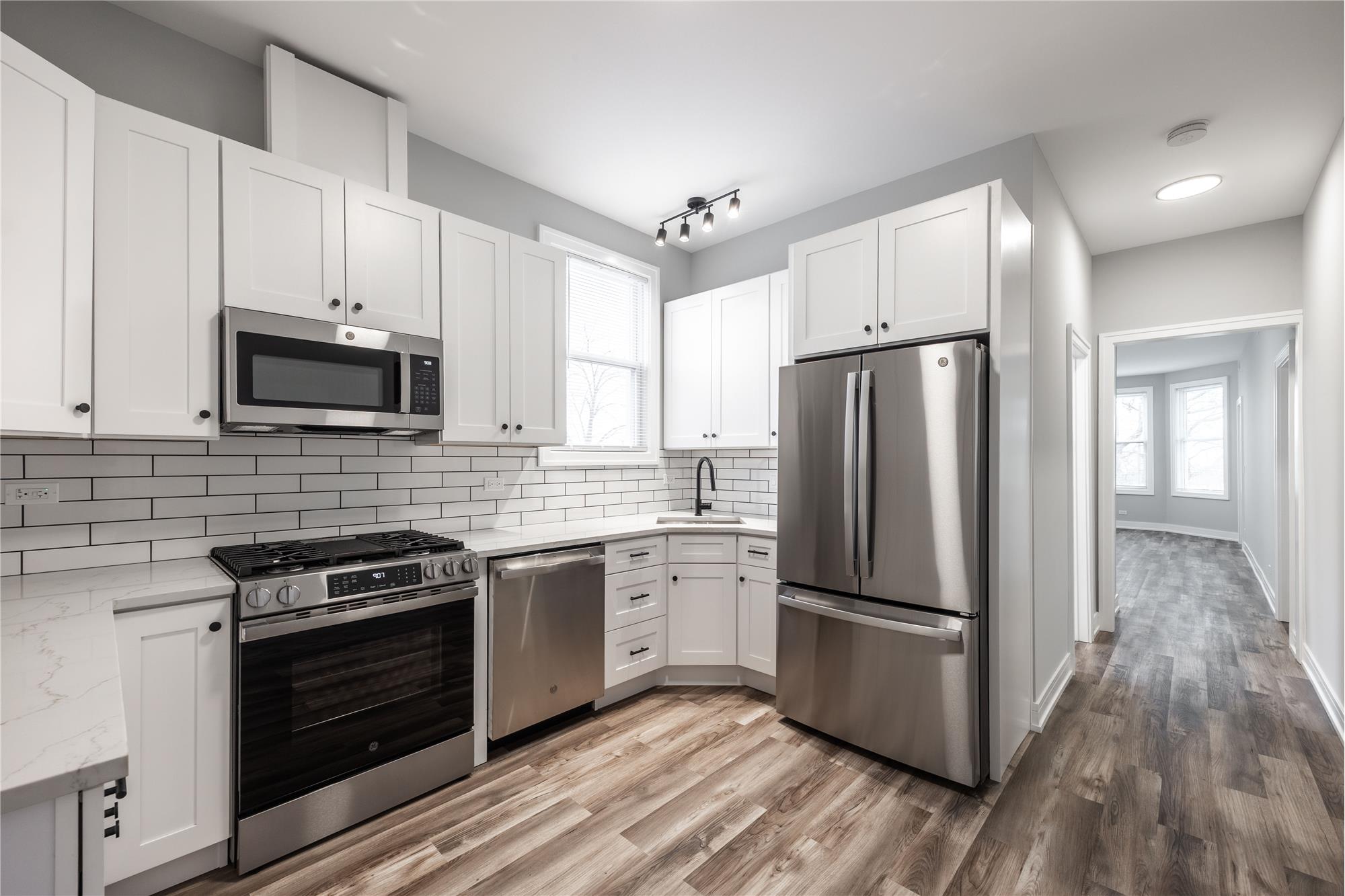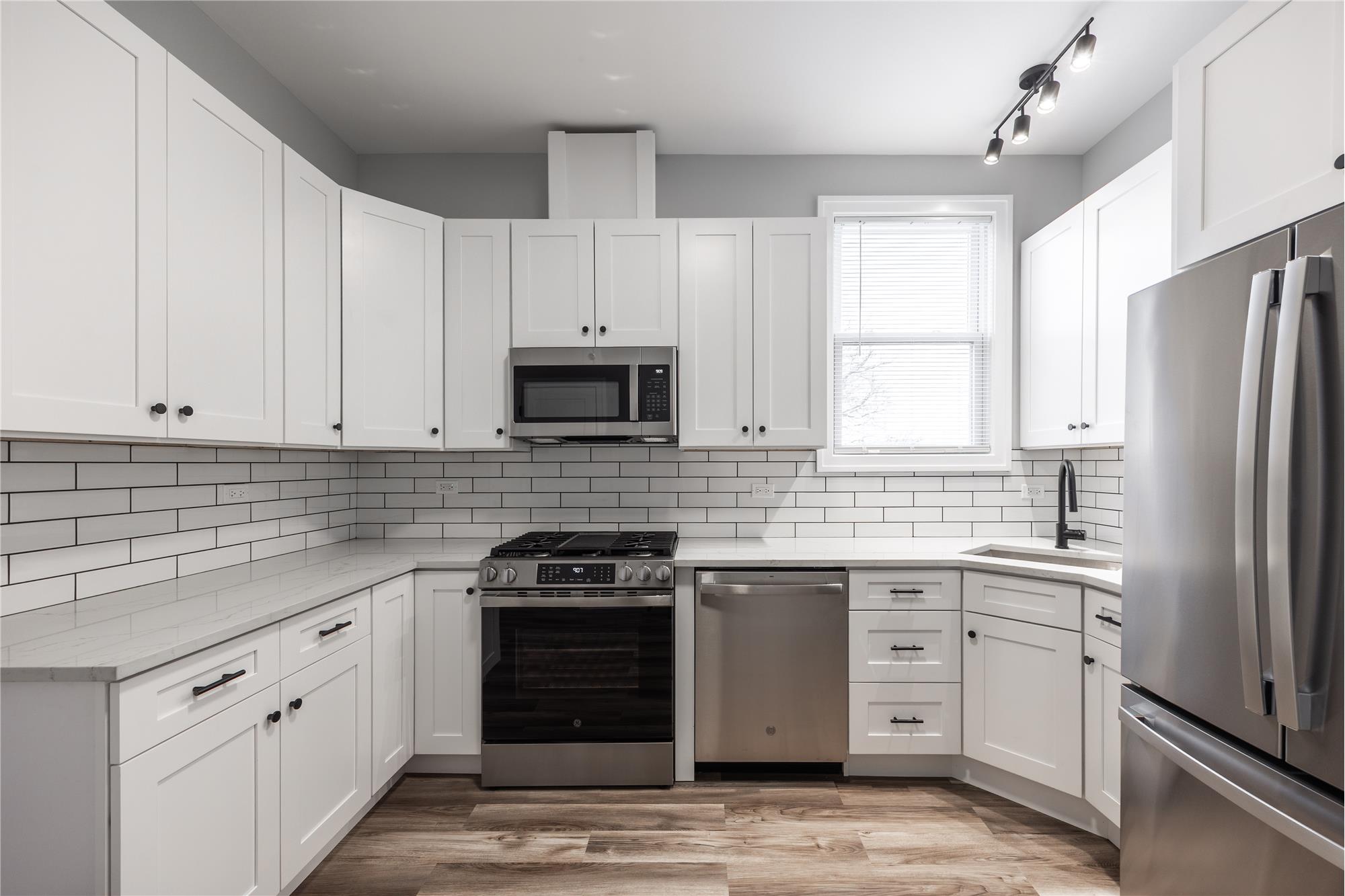 * Modern kitchen with **quartz countertops and stainless steel appliances**