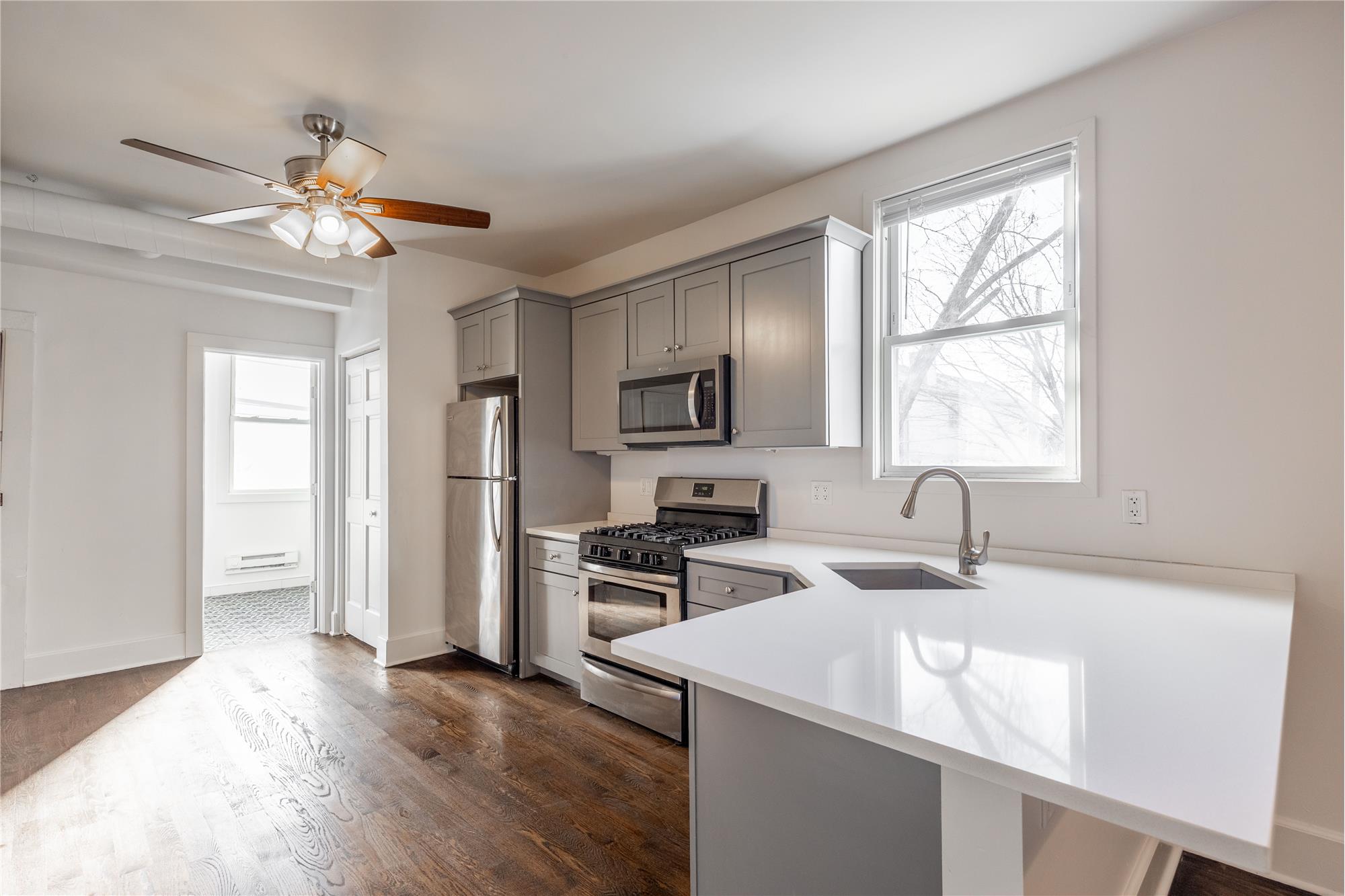 The apartment features a large open living space, beautifully refinished hardwood floors, and high ceilings that create a bright, airy feel throughout the home. The brand-new kitchen and bathroom include modern finishes and a gorgeous kitchen island, perfect for cooking and entertaining.