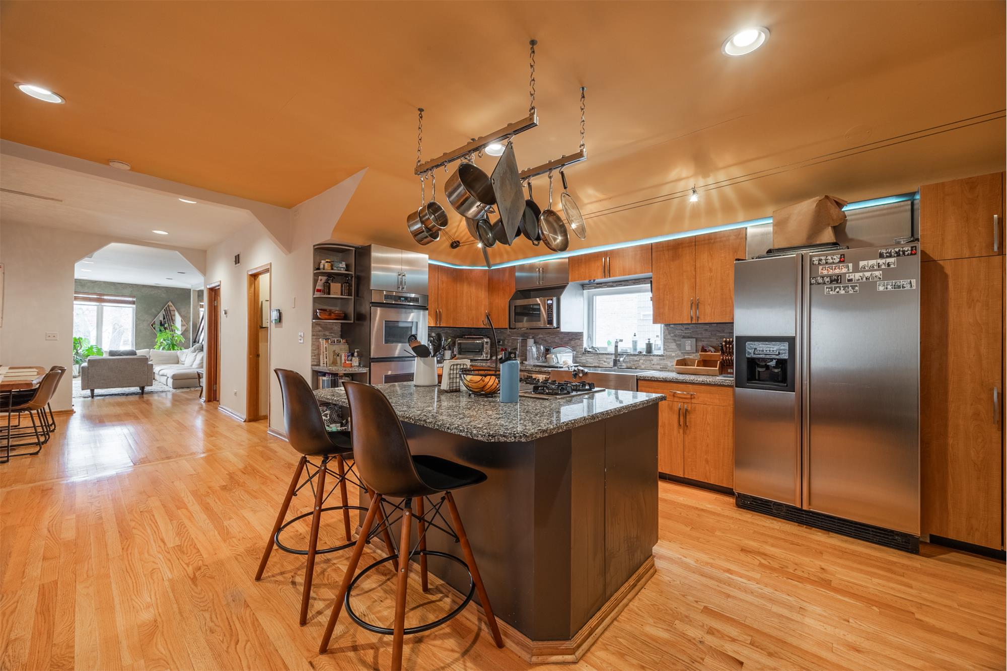 The chefs kitchen is fully equipped with granite countertops, a large island, and high-end stainless steel appliances including Dacor dual ovens, a Thermador stove with retractable vent, and a Bosch dishwasher.