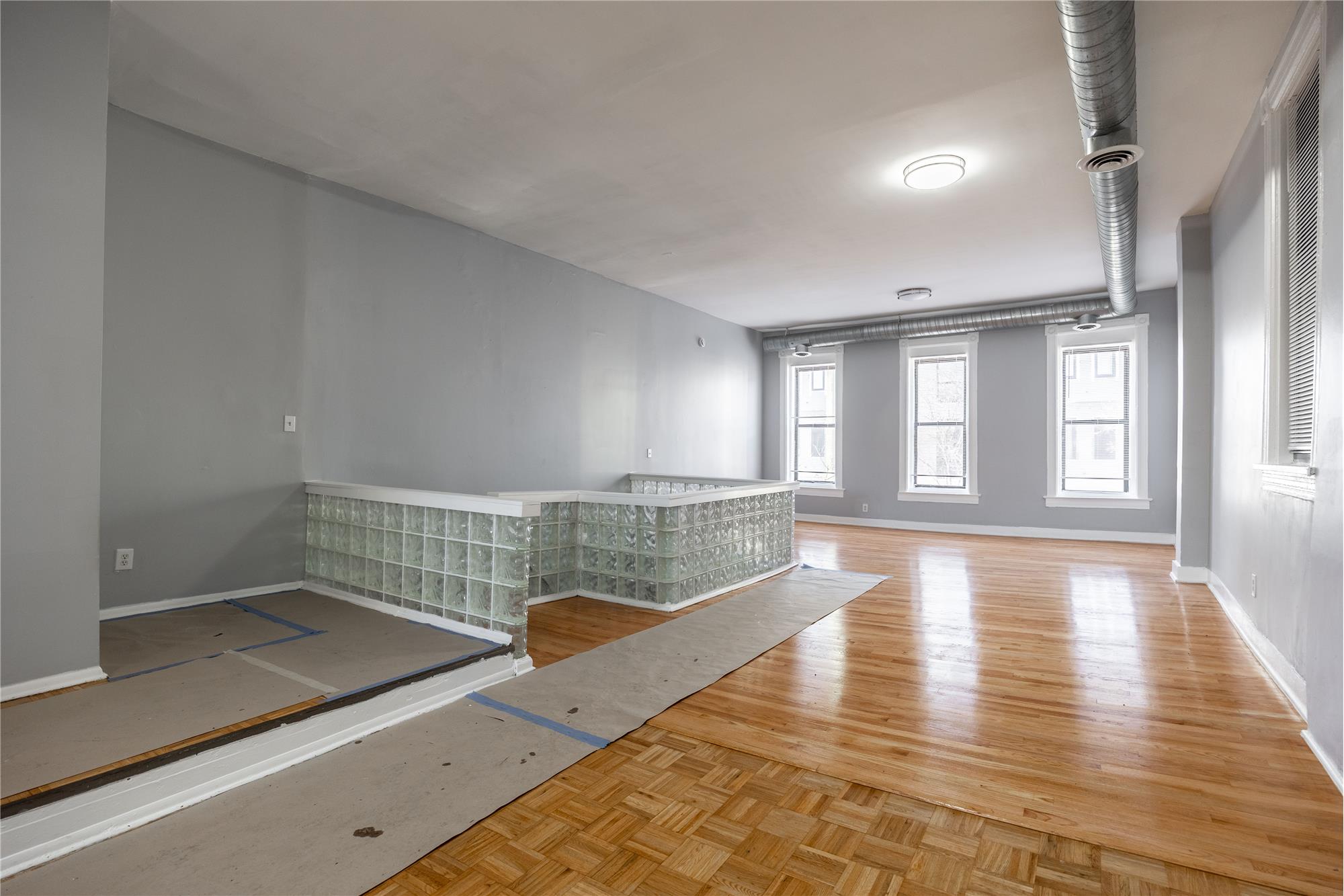 The unit features a well-designed layout with hardwood floors, high ceilings, and large windows that flood the space with natural light.