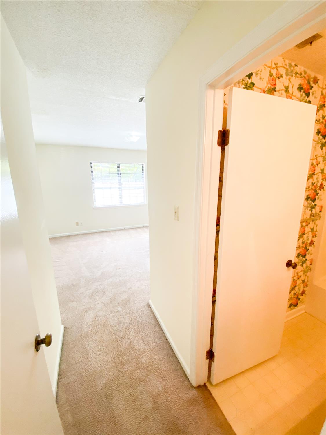 The kitchen features a window above the sink and has open entries at both ends, allowing easy movement between rooms. Interior details include two-tone paint with tan walls and white trim, along with carpet and vinyl flooring throughout the home.