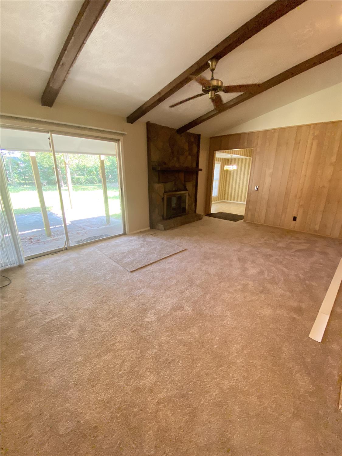Wood beam ceiling detail in living and dining areas