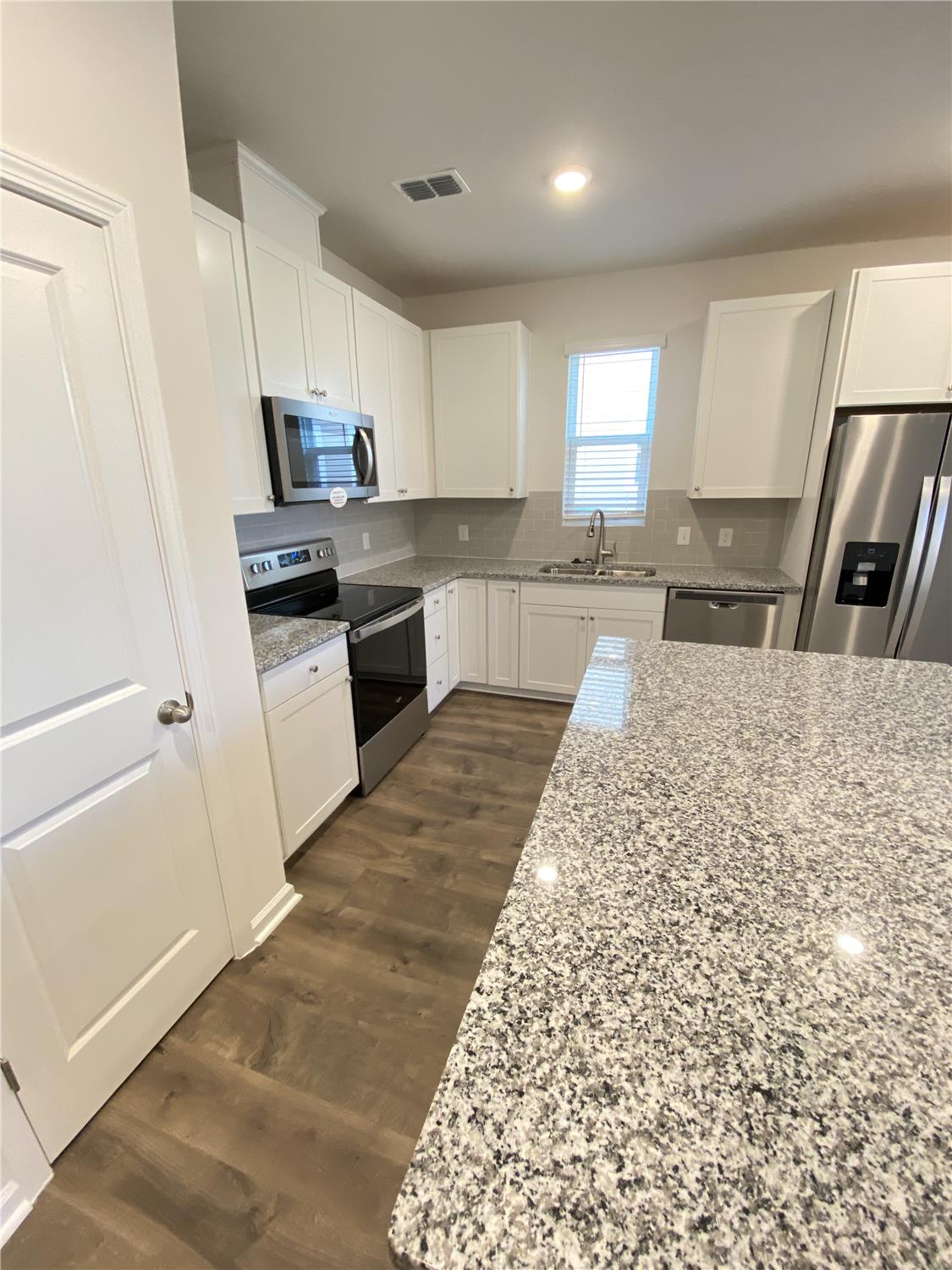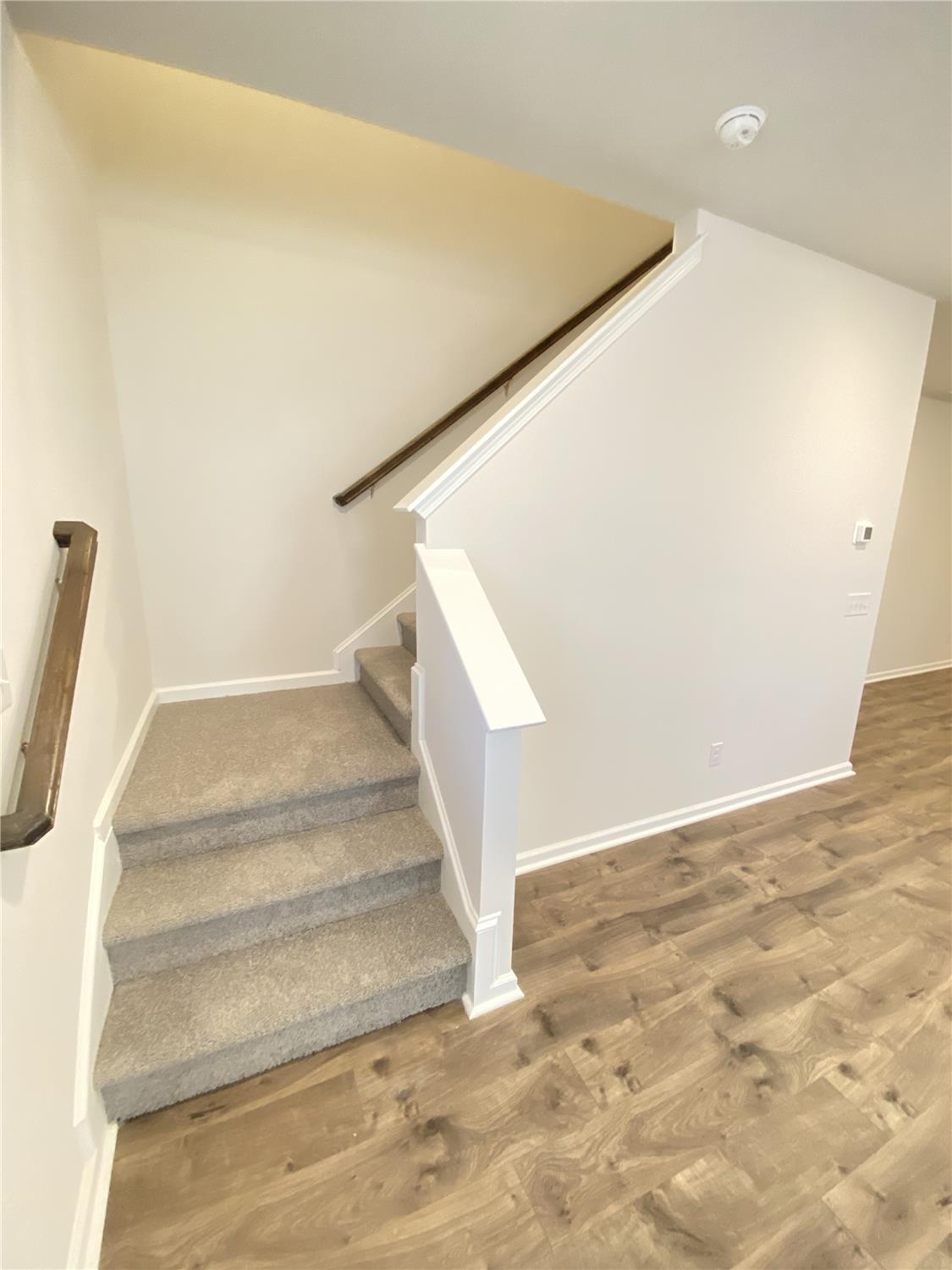 This townhome features an open concept floor plan with wood plank flooring on the first level and a kitchen with granite countertops and stainless steel appliances.