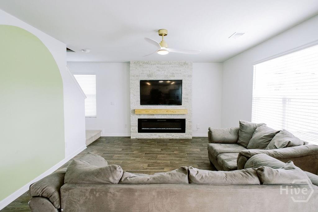 The kitchen features ample cabinet and counter space and comes equipped with a stove, refrigerator, dishwasher, and microwave. The living room includes a fireplace with hidden storage and a modern smart ceiling fan for added comfort.