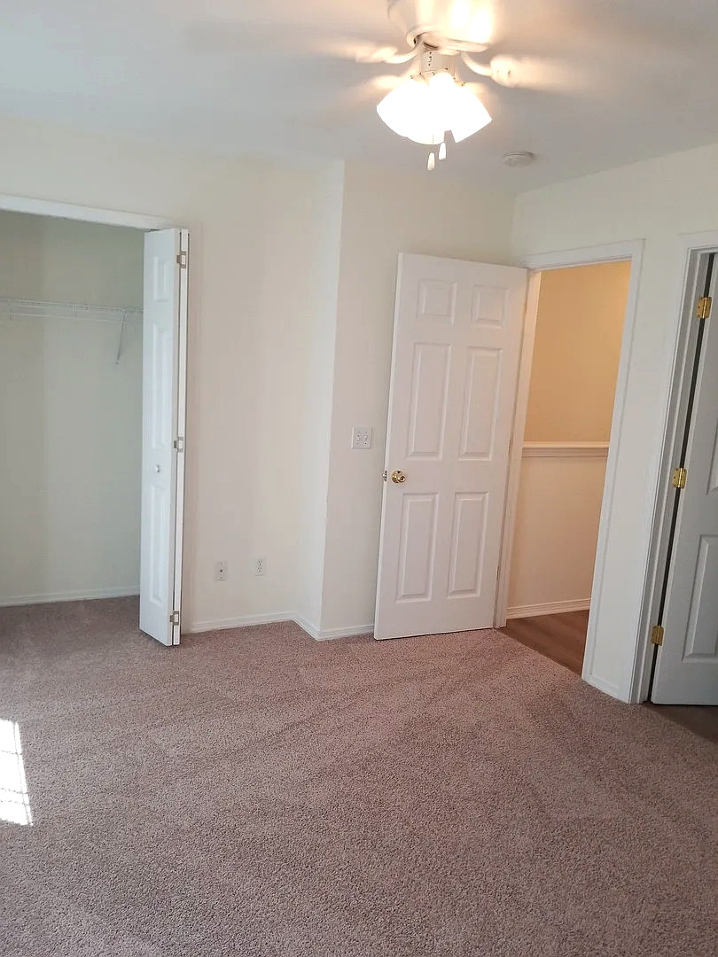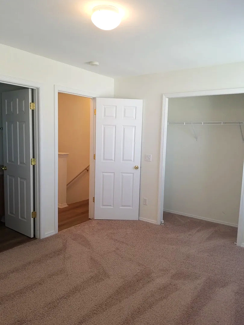 The main level features luxury vinyl plank flooring and an open living area that connects seamlessly to the kitchen and dining space. Upstairs, both bedrooms are carpeted and include private full bathrooms, providing separation and flexibility for roommates, guests, or work-from-home use. A half bath on the main level adds convenience for visitors.
