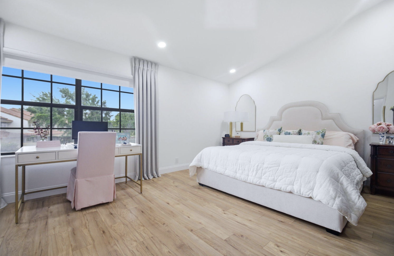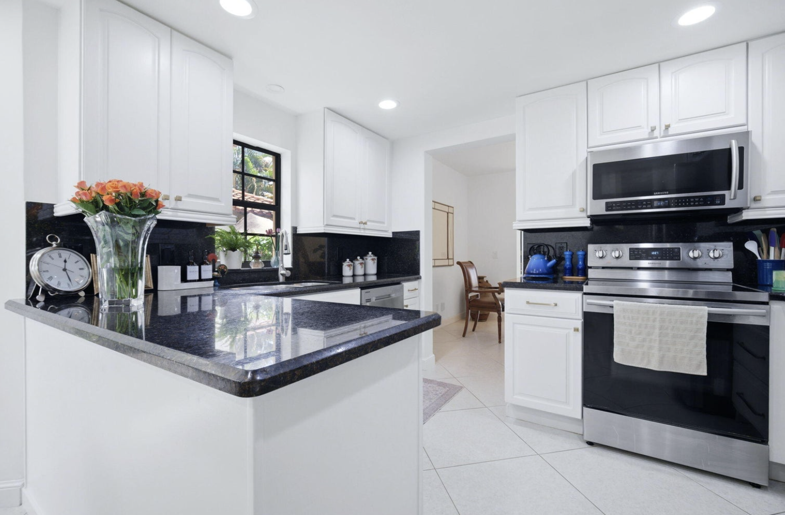 Beautifully updated corner townhome in the highly desirable gated community of La Mirada at Boca Pointe, offering serene lake and green space views. This spacious 4-bedroom, 2.5-bath residence features over 2,200 square feet of thoughtfully designed living space, including a converted garage that serves as a stunning fourth bedroom/den/office. The home boasts soaring vaulted ceilings, skylights, and an abundance of natural light throughout. The open-concept layout is enhanced by large tile flooring on the main level and newer gray laminate flooring upstairs. The updated kitchen is equipped with granite countertops and stainless-steel appliances, creating a perfect space for both everyday living and entertaining. Upstairs, all bedrooms were refreshed,