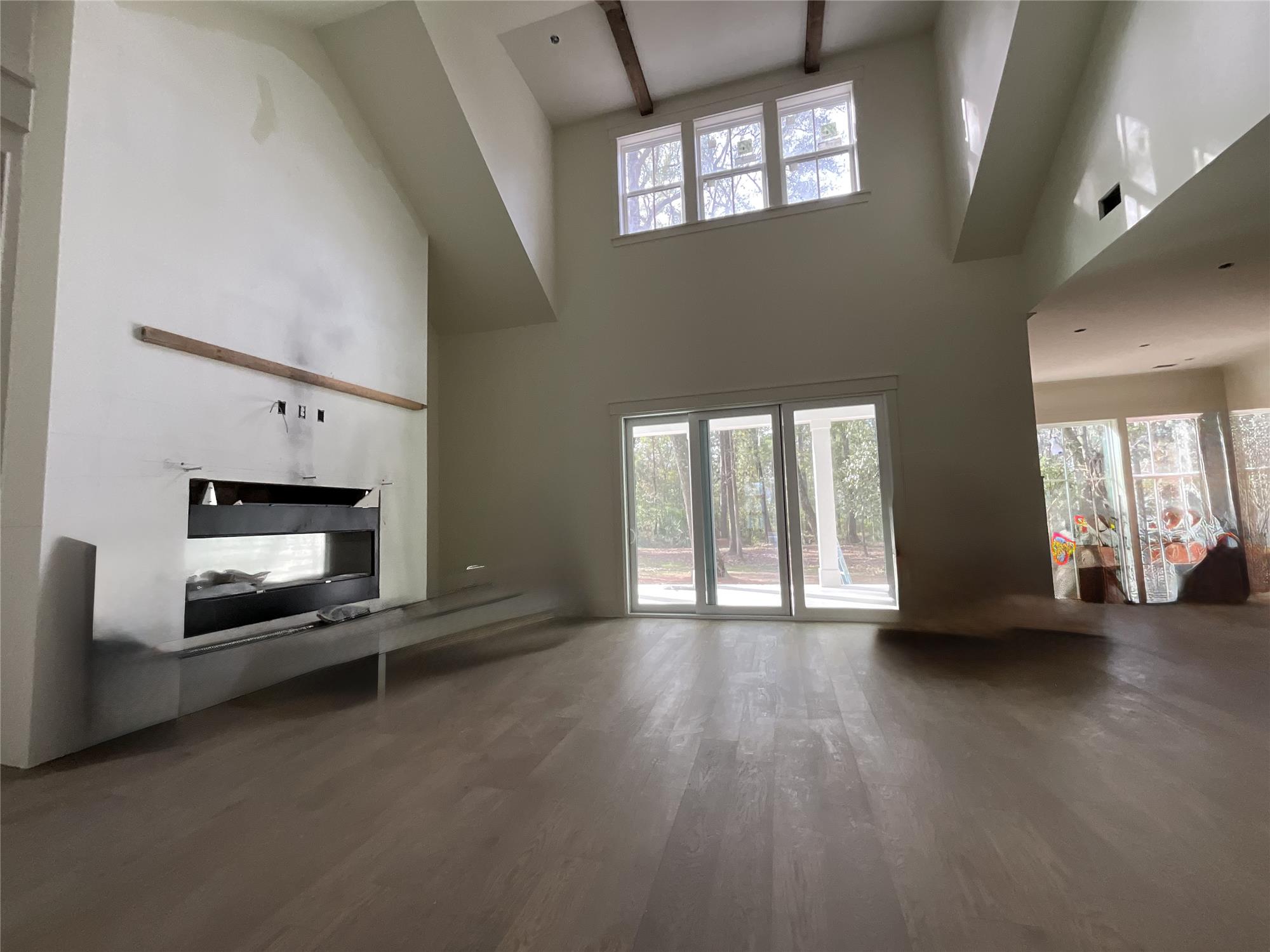 A foyer entry statement with transom windows, framed trim, and wainscoting opens into the heart of the home – a vaulted great room with soaring 22’ ceilings, exposed beams, and a sleek linear fireplace. The chef’s kitchen and butler’s pantry/back kitchen showcase a ZLINE appliance package, quartz countertops, wine fridge, microwave, bar sink, and refrigerator rough-in, designed for both elegance and function. A dedicated wine/coffee bar with custom cabinetry adds a refined touch.