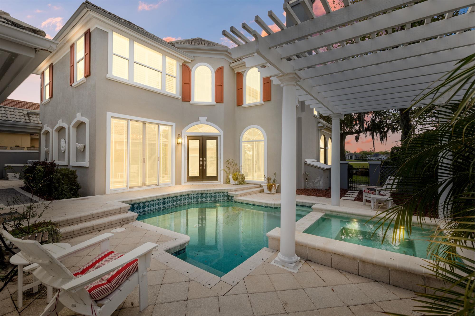 From the entrance, one is welcomed by elegant gates, a lush courtyard with water features including a pool, spa & trellis. The main home features a breezy light filled entryway to the 2 story living space with built ins, warm & light wood tones, a separate formal dining, a sitting room with custom wine bar leading to the updated kitchen and outdoor space blending seamlessly with an enclosed lanai and spacious back patio overlooking the Plantation's Grand Lake & the 10th Fairway.